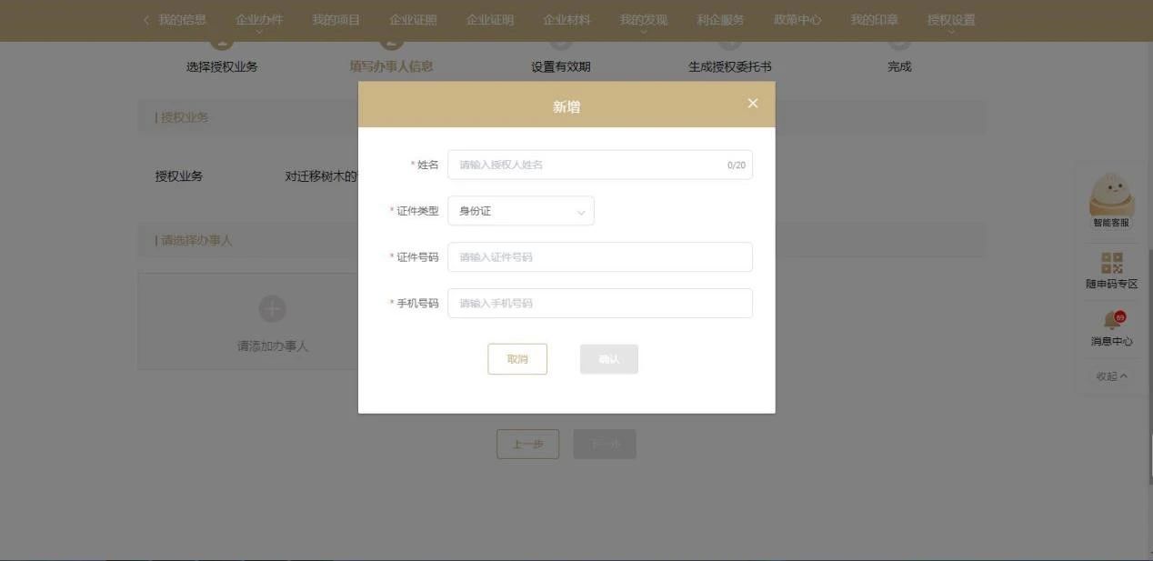 根据弹窗提示添加被授权人信息,并选择一个需要授权的办事人,点击下一步;
