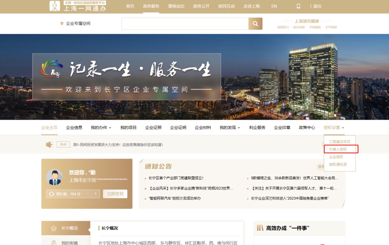 企业法人通过电子营业执照或法人一证通账号登录进入“一网通办”长宁区企业专属空间,点击右侧“授权设置”—“办事人授权”,向办事人进行授权操作;