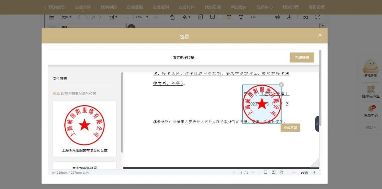 确认委托书无误后,点击签章按钮进行签章;