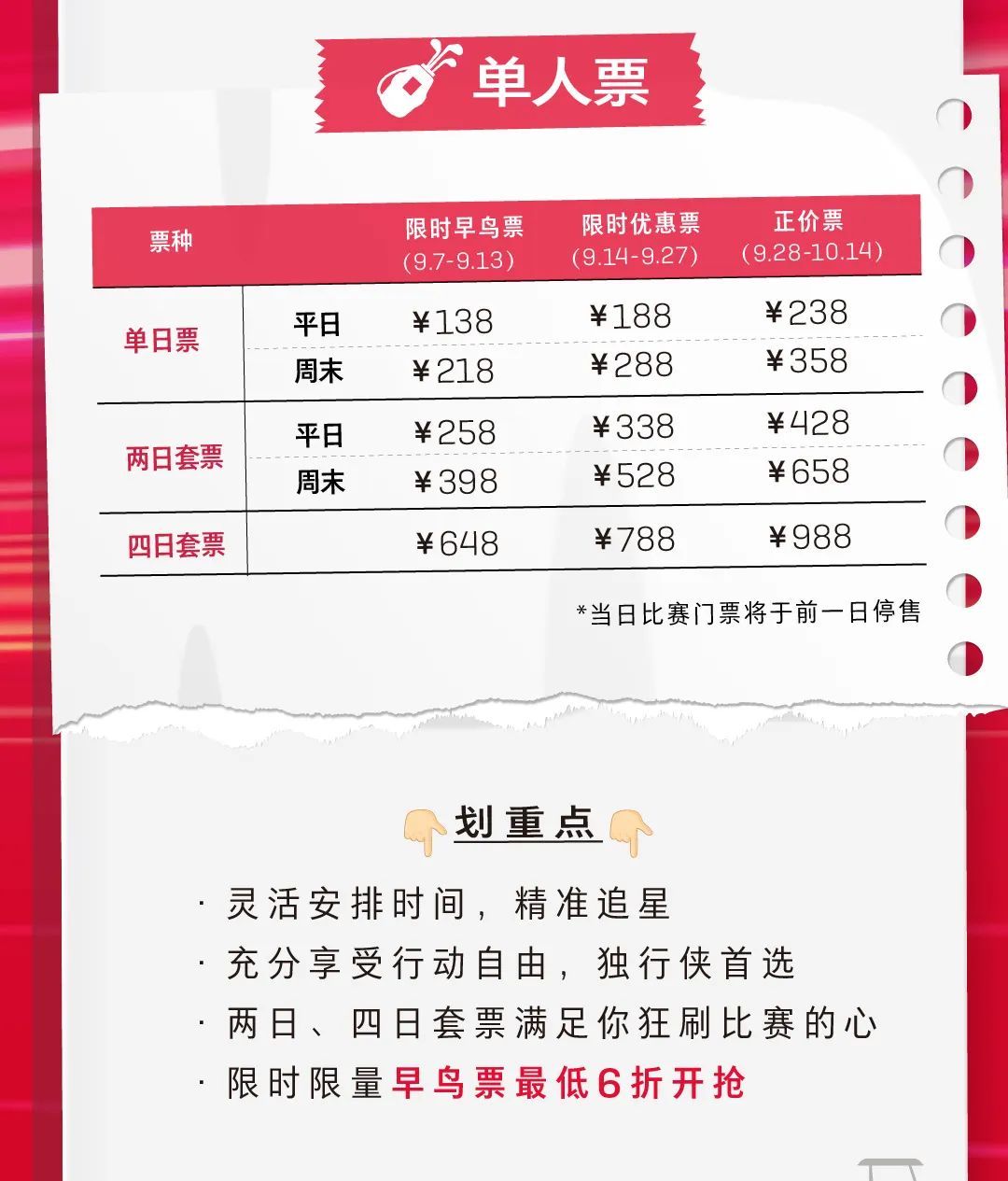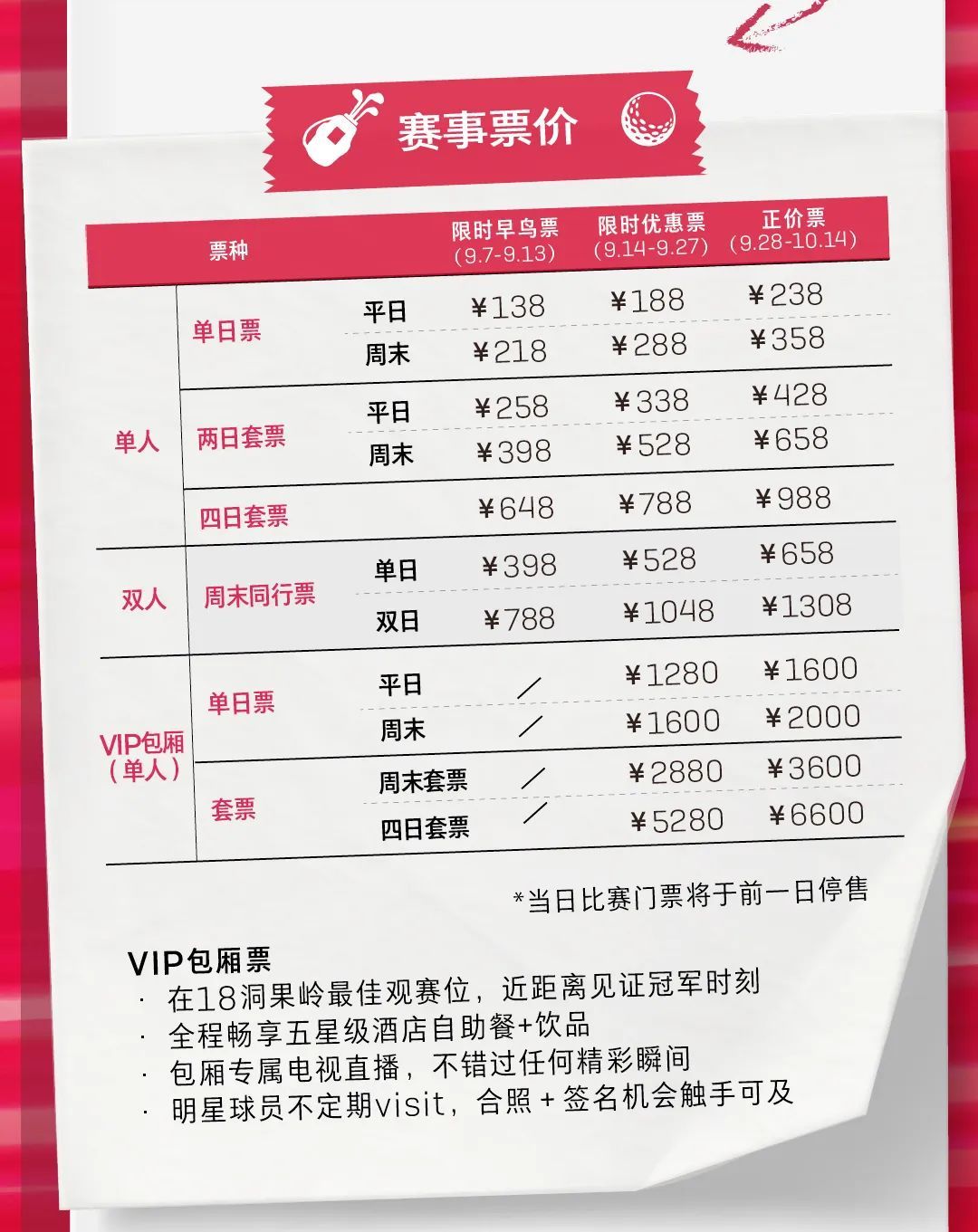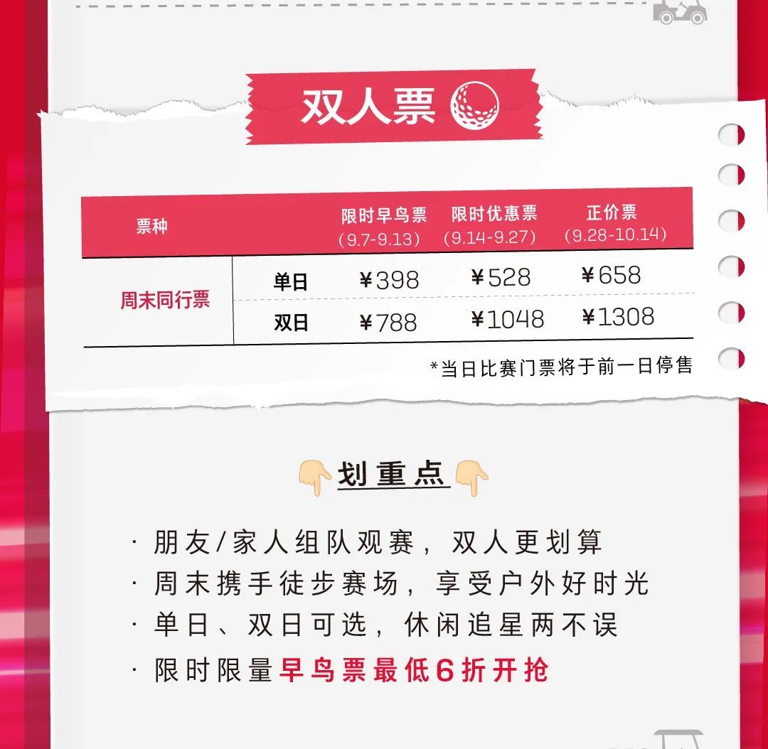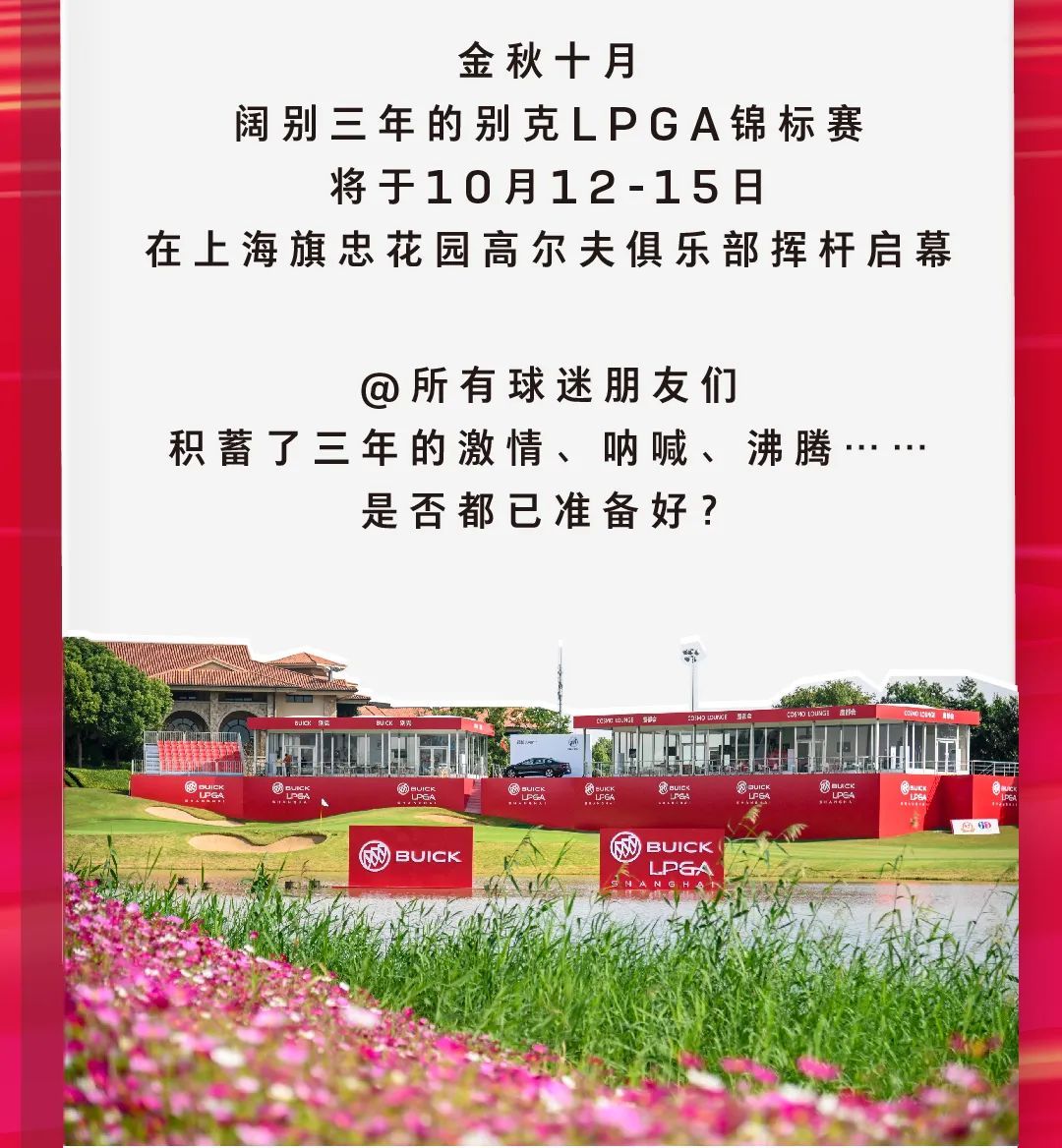 2023别克LPGA锦标赛将于10月12日至15日,在位于闵行区马桥镇的上海旗忠花园高尔夫俱乐部拉开帷幕。首批早鸟票最低6折,于9月7日—9月13日发售,预购从速哦。具体票务信息如下: