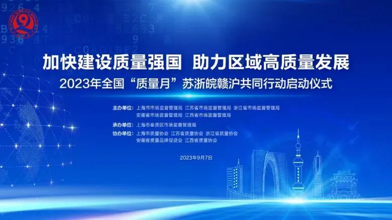 9月7日,2023年全国“质量月”苏浙皖赣沪共同行动启动仪式在上海举行。市政府副秘书长庄木弟出席仪式并宣布共同行动启动,奉贤区委书记袁泉出席活动,奉贤区区长王益群致辞,市市场监管局副局长陈彦峰介绍2023年苏浙皖赣沪“质量月”主要活动安排,江苏、浙江、安徽、江西四省市场监管局负责人出席了仪式。