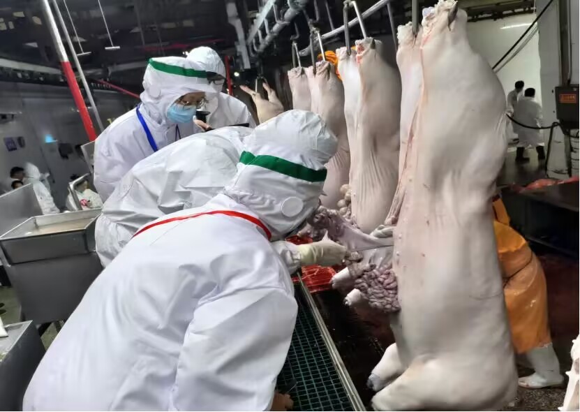 此次竞赛分为理论考试和现场技能操作考核两部分。理论考试闭卷进行,主要考核动物检疫人员对法律法规、规章制度、技术规范等相关知识的掌握情况。现场技能操作考核在潍坊振祥食品有限公司生猪屠宰线上进行,共设置头蹄、咬肌、肺心肝、胃肠脾、胴体和旋毛虫六个岗位进行操作考评,主要考核动物检疫人员生猪屠宰同步检疫操作的准确性和熟练度。