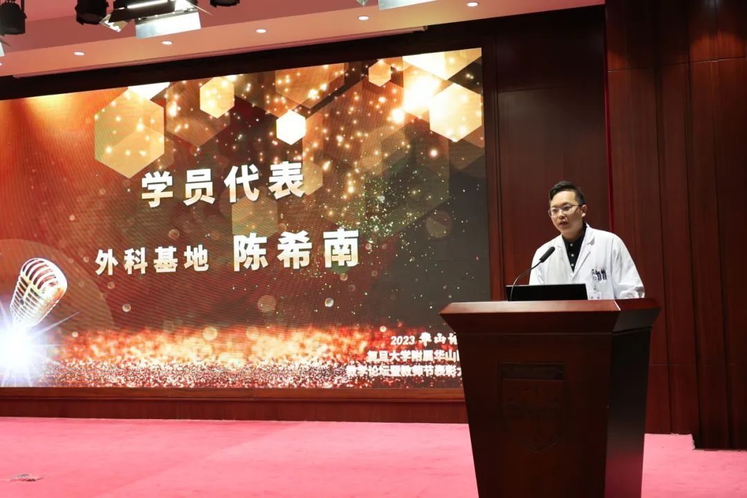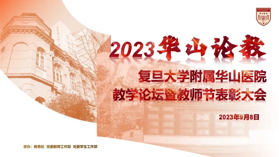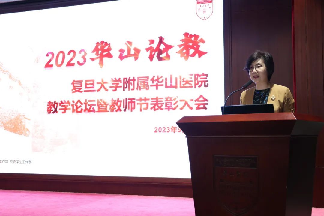 在第39个教师节来临之际,由医院教育处、党委教师工作部、党委学生工作部联合主办的“2023华山论教”复旦大学附属华山医院教学论坛暨教师节表彰大会在门诊12楼会议厅举行。院长毛颖,副院长伍蓉,党委副书记顾宇翔,副院长吕飞舟、钦伦秀,总会计师周海平,医院各职能部门负责人,临床科室主任、党支部书记、临床护理教学骨干、优秀教师代表等参会。