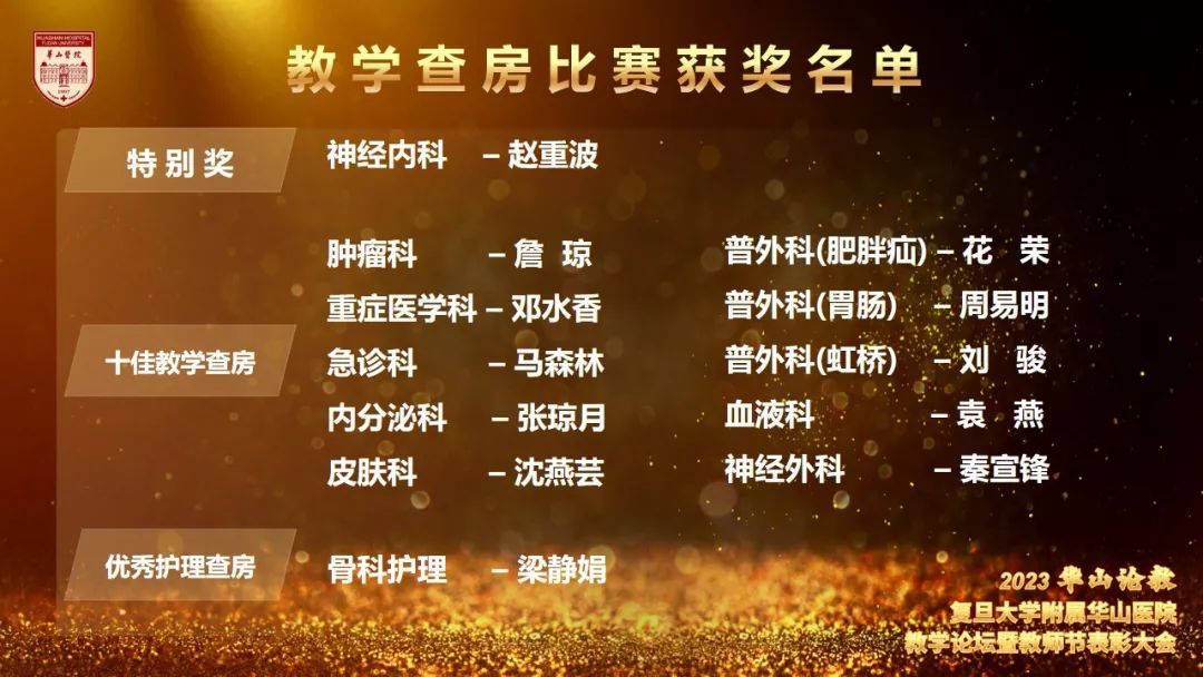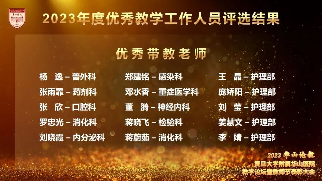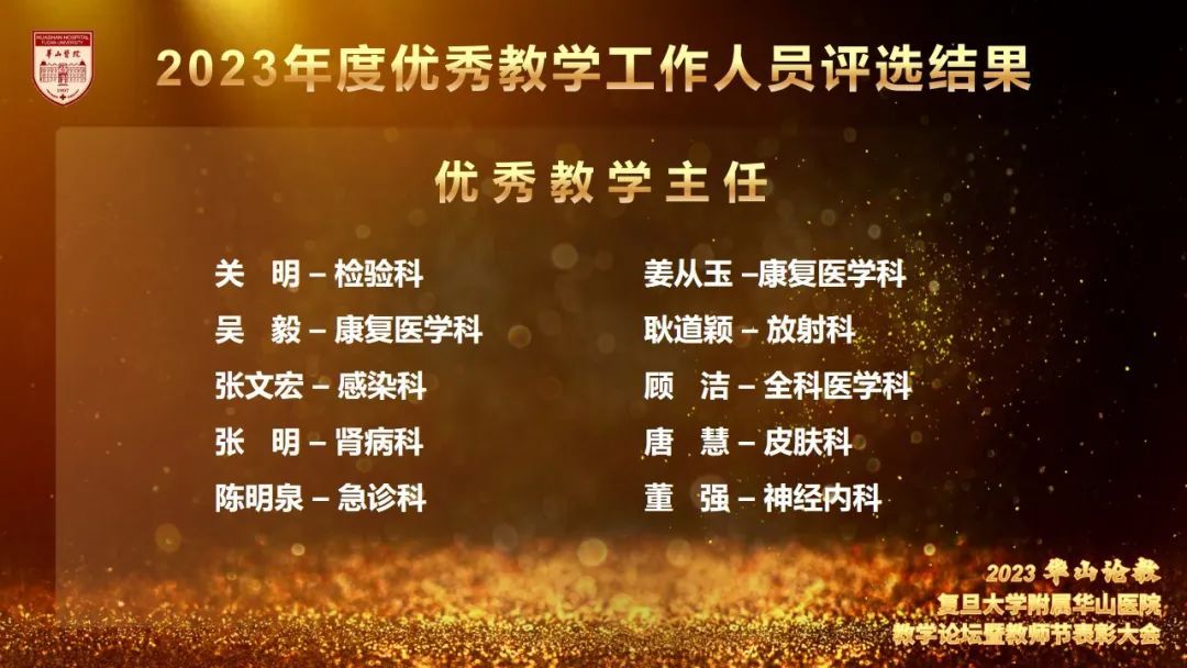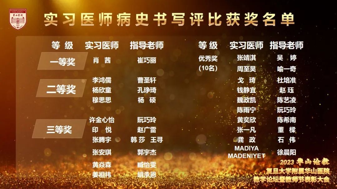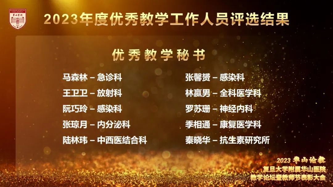 为更好地营造立德树人氛围,推动医院教学工作开展,今年8月起,教育处、党委教师工作部、党委学生工作部联合组织举办了华山教学月系列活动,包括各类师资培训,教师教学能力比赛、学员临床能力比赛及系列优学评优三大板块。各学科积极组织参加各类活动,踊跃报名参加各项比赛,充分展示了华山浓浓的教学氛围,挖掘出了一批优秀教学人才。教育处叶红英处长宣读“青年教师课程授课竞赛获奖名单”“教学查房比赛获奖名单”“实习医师病史书写评比获奖名单”“实习医师病史汇报大赛获奖名单”“内科住院医师病例汇报大赛(感染专场)获奖名单”“住院医师临床培训及技能大赛获奖名单”“住院医师临床培训及技能大赛获奖名单”“2023年度优秀教学主任名单”“2023年度优秀研究生导师名单”“2023年度优秀带教老师名单”“2023年度优秀教学秘书名单”。
