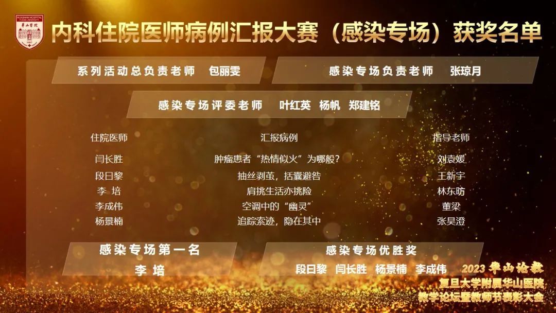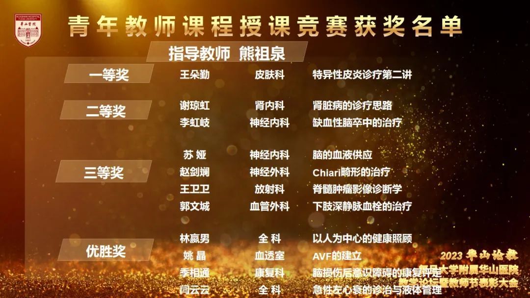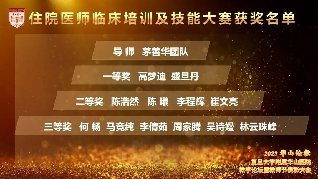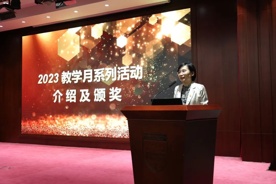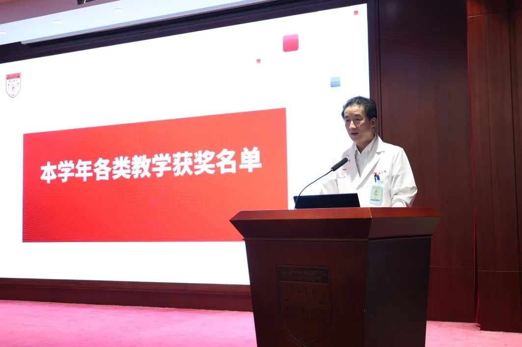 为更好地营造立德树人氛围,推动医院教学工作开展,今年8月起,教育处、党委教师工作部、党委学生工作部联合组织举办了华山教学月系列活动,包括各类师资培训,教师教学能力比赛、学员临床能力比赛及系列优学评优三大板块。各学科积极组织参加各类活动,踊跃报名参加各项比赛,充分展示了华山浓浓的教学氛围,挖掘出了一批优秀教学人才。教育处叶红英处长宣读“青年教师课程授课竞赛获奖名单”“教学查房比赛获奖名单”“实习医师病史书写评比获奖名单”“实习医师病史汇报大赛获奖名单”“内科住院医师病例汇报大赛(感染专场)获奖名单”“住院医师临床培训及技能大赛获奖名单”“住院医师临床培训及技能大赛获奖名单”“2023年度优秀教学主任名单”“2023年度优秀研究生导师名单”“2023年度优秀带教老师名单”“2023年度优秀教学秘书名单”。