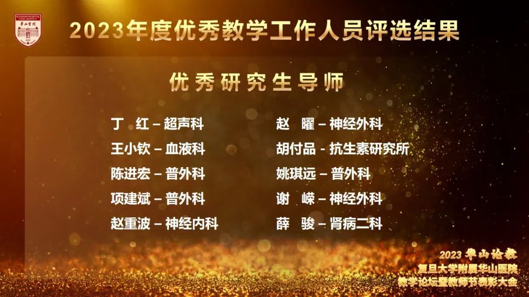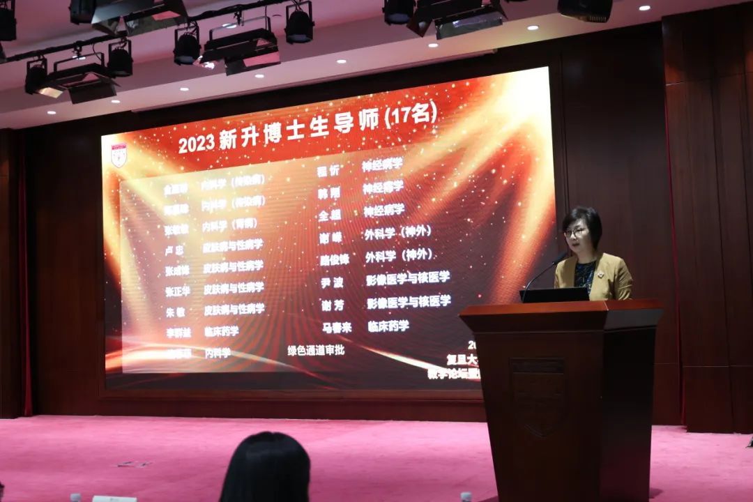 教学工作的长足进步离不开一代又一代教师的辛勤付出。伍蓉副院长宣读2023年新升研究生导师名单。今年华山医院共新升17名博士生导师、32名硕士生导师,期待他们接续前进,为华山的诊疗、科研注入新的活力。