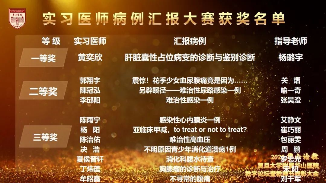 “教师”既是称谓,更是责任。正是因为有了一批批尽责奉献的优秀老师,华山医院才能培养出一代代优秀人才。吕飞舟副院长宣读近年复旦大学“钟扬式”好老师及华山医院本学年各类教学获奖名单。