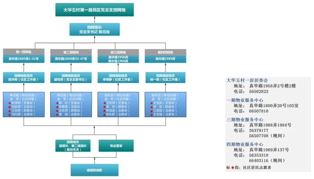 为满足三片辖区不同的管理需求,实现社区治理精细化、高效化,居民区以党建为引领,通过前期的“居民打钩”意见征询、楼组长会议等方式确定了“居住型网格治理”打造项目。大华五村一居党总支按照需求和户数情况,将所管辖小区划分为4个微网格,并系统梳理网格内党组织成员、居民骨干、报到党员、楼组长等力量,组建起微网格工作小组,通过联席会议讨论制定了“微网格治理图”,按照选优配强原则配置成员,逐步形成“1+4+N”社区网格工作体系(1个居民区党总支+“微网格长、微网格联络员、红班长、微网格员”核心小组+N个志愿者),并向居民公布微网格治理图及责任人联络方式。此外,为进一步延伸服务触角,夯实治理基础,社区倡议党员参与楼组网格治理,鼓励在职党员主动上台,报名担任“第二楼组长”。