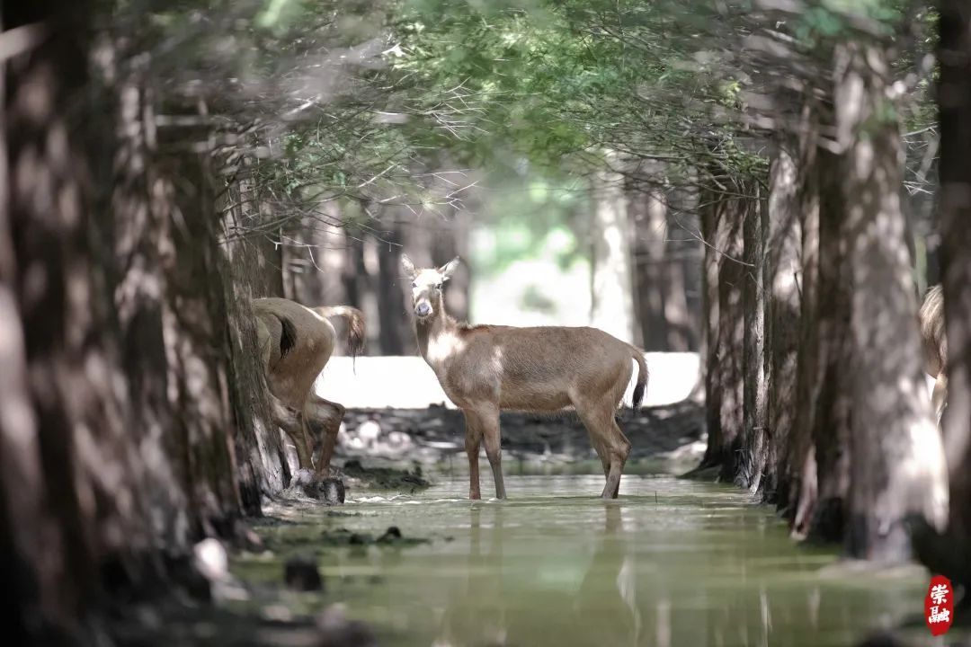 走进麋鹿苑,整个区域生态环境秀美,水杉树在水面上泛起倒影,构成了一片极富艺术感的“水上森林”。据介绍,麋鹿怕热不怕冷,夏天喜欢在低洼有水的区域活动,这里的环境正是为麋鹿量身打造。