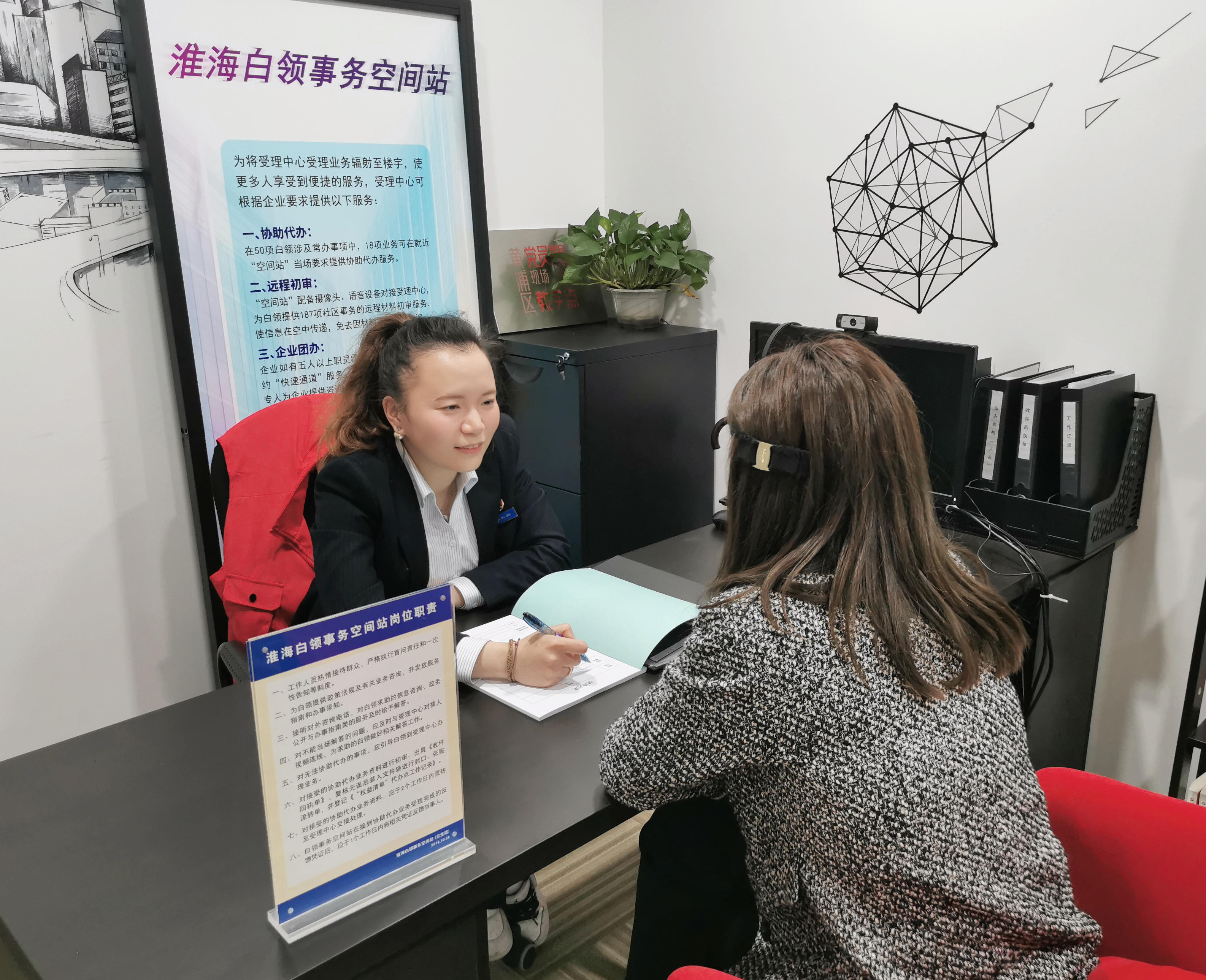 东部街区党委通过织密楼宇党群阵地,构建立体化的党群服务工作体系。兰生大厦楼宇党群服务站于今年4月起进一步实现政务服务融合,在原本“云服务”基础上,由街道事务受理服务中心派遣业务骨干定期坐班,打造集党员教育、党性锻炼、党员服务于一体的综合性红色阵地。