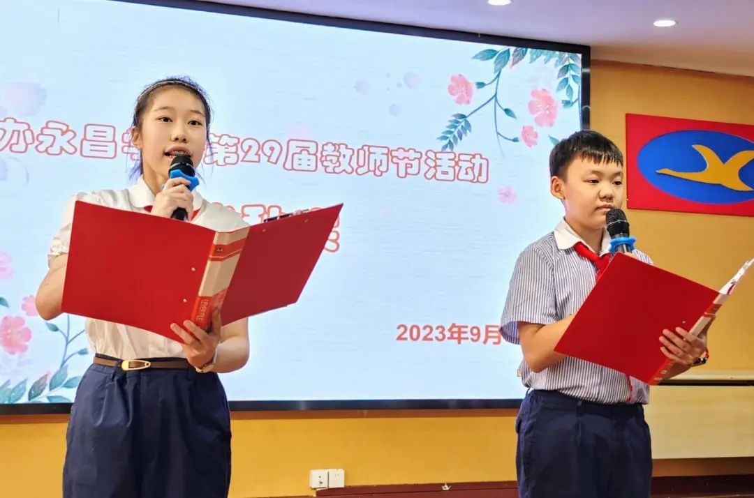 校园里,春华秋实——上海民办永昌学校第29届教师节活动在多功能厅举行,除了为老师们带来一场生动的演出,学生代表们还逐一向老师们送上鲜花,表达着感恩与祝福。同时,新中队辅导员聘任仪式也在活动上举行,董事长俞靖明、书记董文光、校长罗永祥为受聘者颁发聘书。“我感受到自己肩上责任的光荣和重大!”新聘中队辅导员代表查媛媛老师发言说,“是孩子们清纯的眼眸给了我力量,是同事们的微笑给了我支持,是家长的信任给了我信心。他们让我勇敢地去战胜一切困难,去体验教育生命的真谛。”