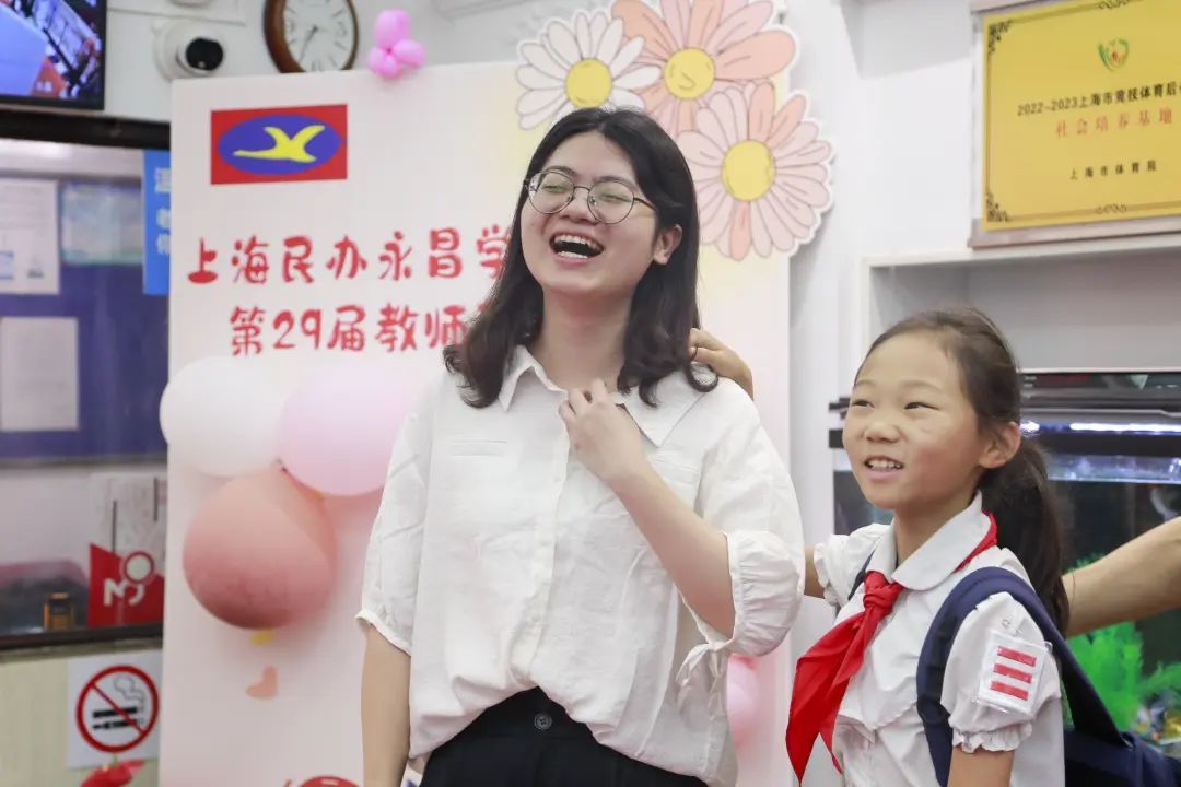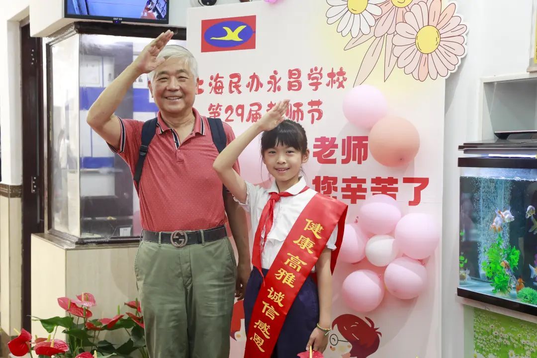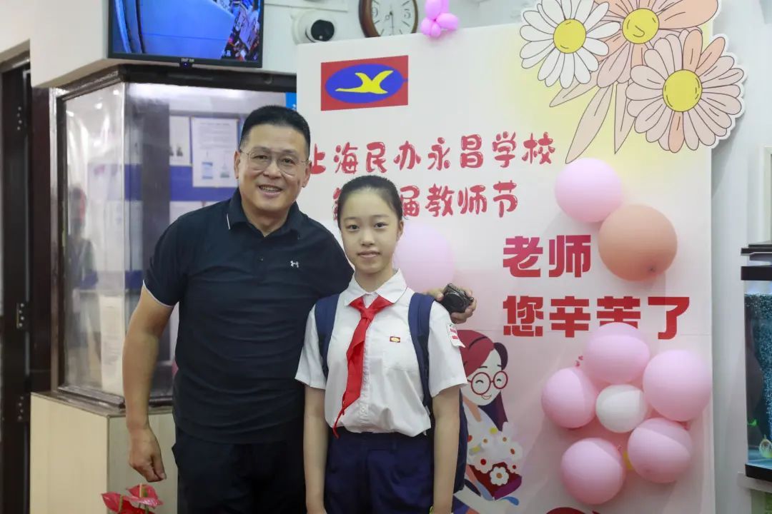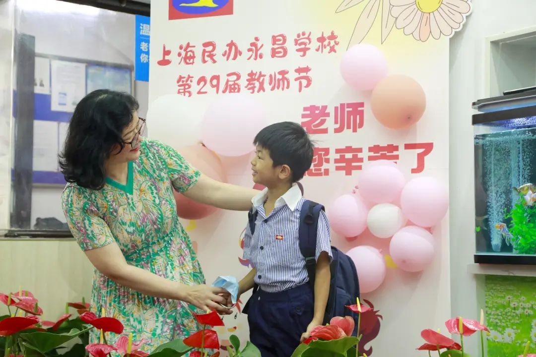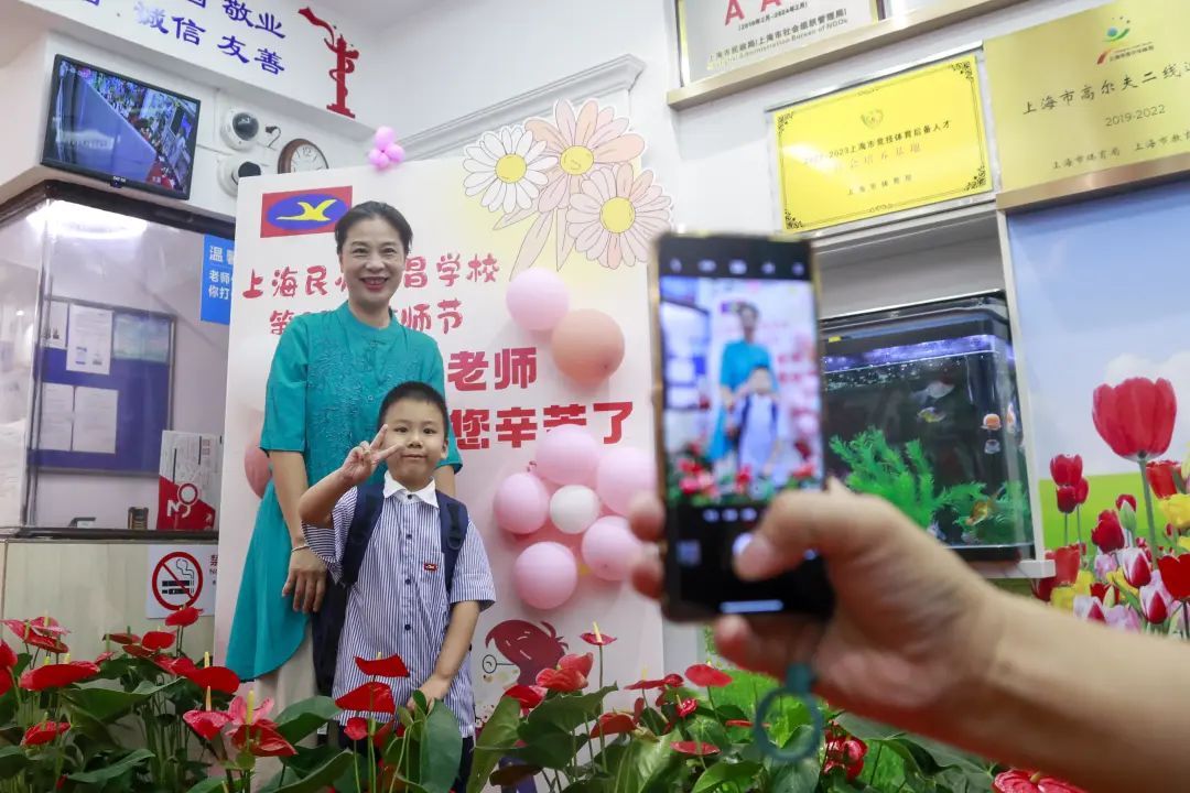 在第39个教师节到来前夕,9月8日一大早,上海民办永昌学校的学生们迎候在校门口,向老师们道上一声“老师,节日快乐”。学校为每位踏入校门的教工们在背景墙前与学生们拍照留影,光影闪烁间,用镜头记录下了这温情又真实的瞬间。