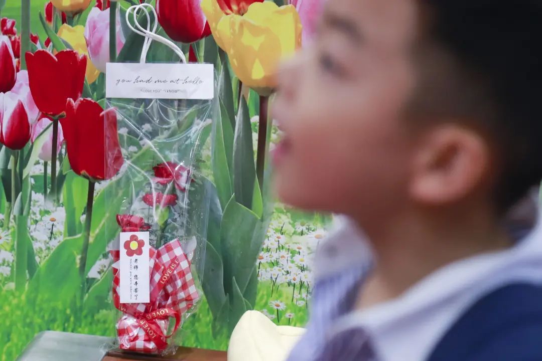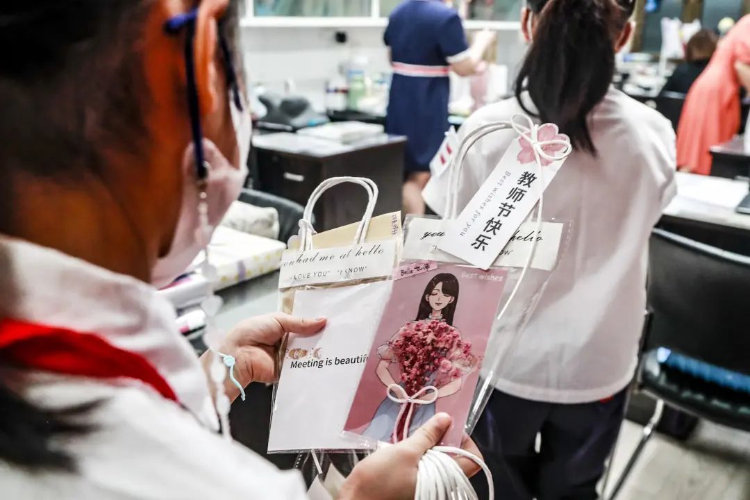 教室里,精致的手绘贺卡、一束鲜花、一盒巧克力……同学们也用着自己的方式,手捧节日祝福送给最亲爱的老师们。