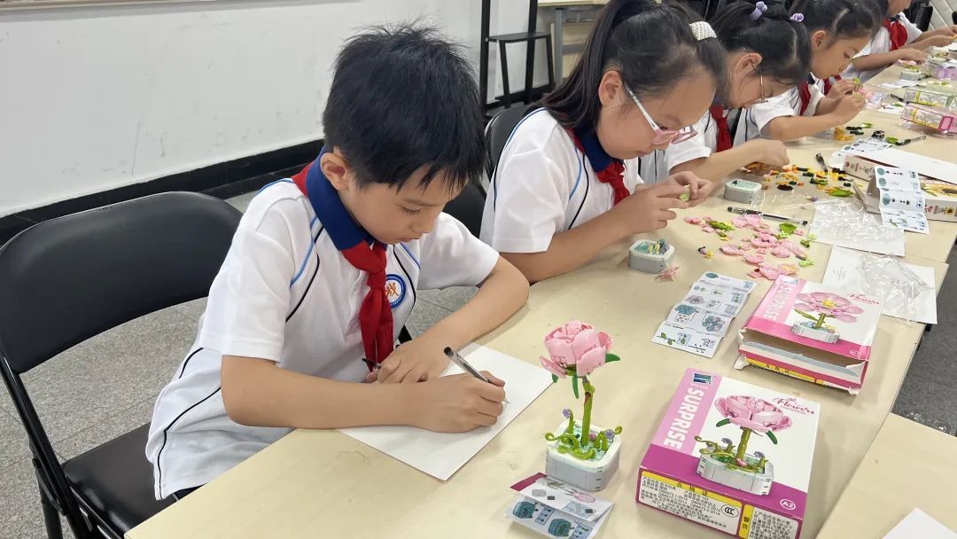 万荣新苑居委会为学生们准备了自制积木花束。学生们需要凭借自己的巧手,拼出一朵朵美丽的积木花束。自制积木花束可以让学生们学会观察与分析,让学生们发挥无限的想象力,拓展思维与创造力。