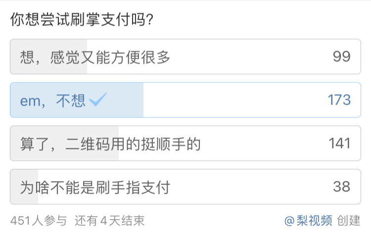 目前在微博关于“你想尝试刷掌支付吗”的投票中,选择不想或者扫码更顺手的网友还是占了多数。