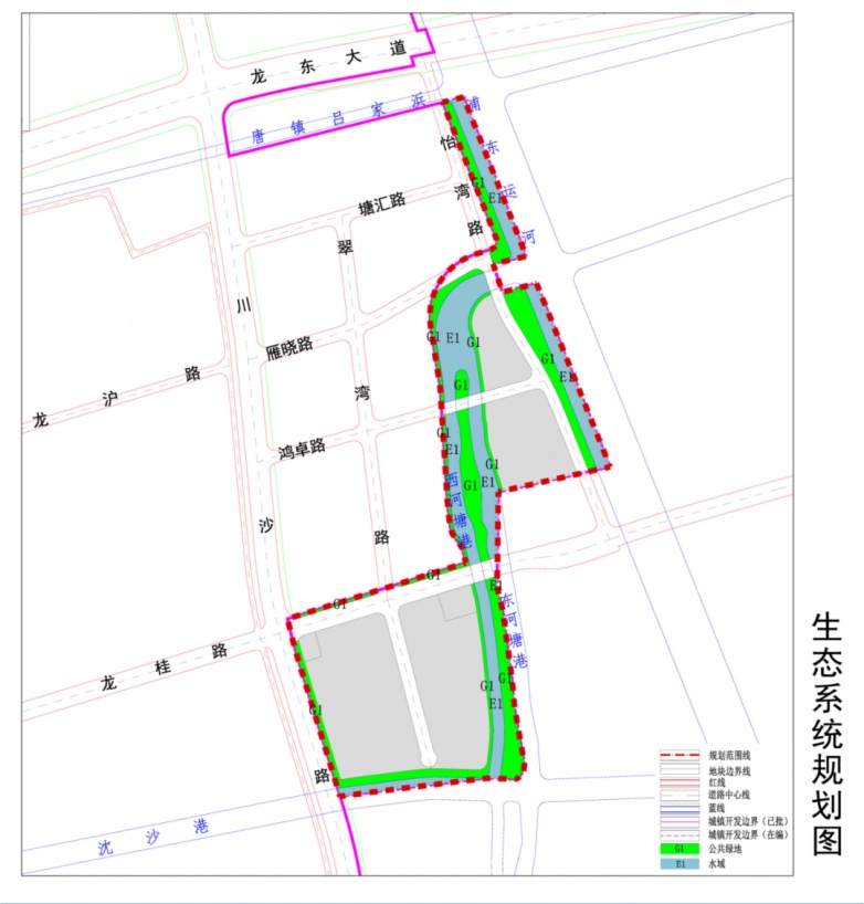 规划公共绿地主要沿浦东运河西岸、河塘港两岸、沈沙港北岸以及龙桂路北侧布局,形成水绿相容的生态空间体系。