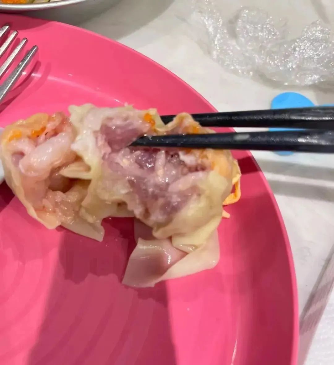 但是在喂孩子吃云吞时,该网友发现云吞馅的颜色看起来像是没有煮熟的粉色,随后她拿了一个自己咬开,结果里面的肉都是生的!