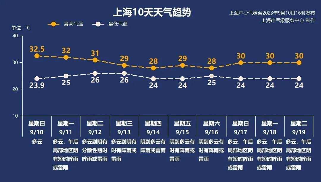 今天(9月11日)上海延续多云为主的天气,体感依然较热,最低25℃,最高气温32℃,相对湿度90%-60%,东到东南风3-4级,午后局部地区有出现短时阵雨或雷雨的可能,范围较小,持续时间较短,大家备好晴雨伞。