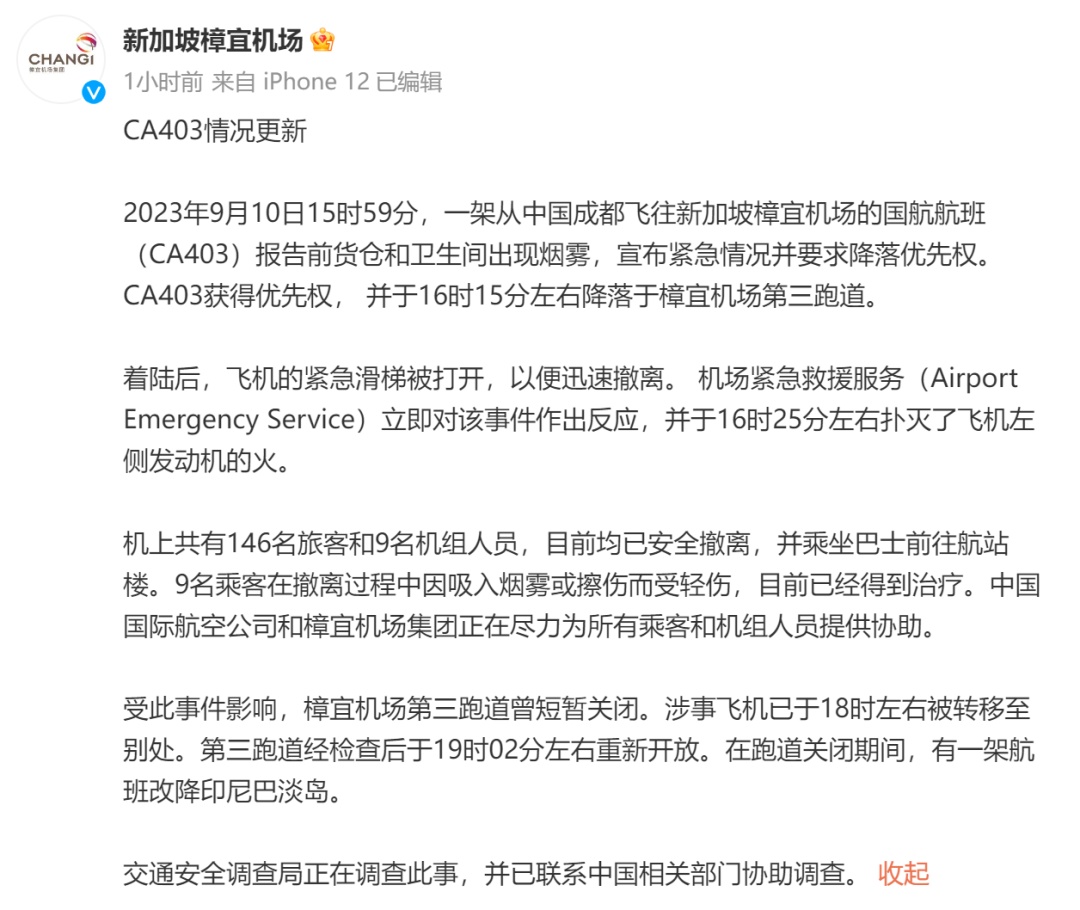 当晚,新加坡樟宜机场官方微博发布了国航CA403航班最新情况: