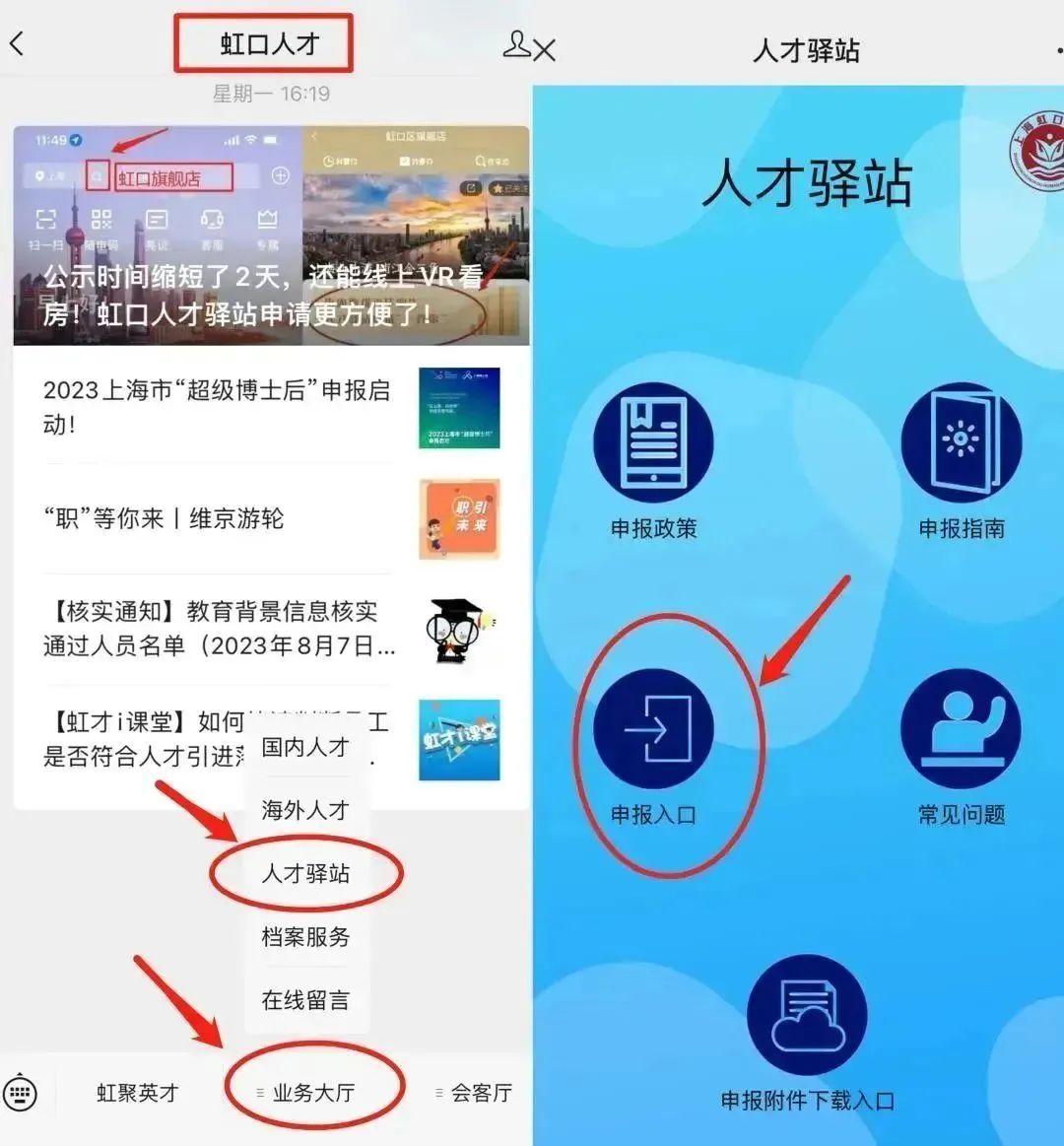 在“随申办”APP或微信、支付宝小程序中搜索“虹口区旗舰店”,点击进入后,在页面中部的banner图中点击“海内外优秀毕业生人才驿站申请‘一件事’”,即可进入相关页面。