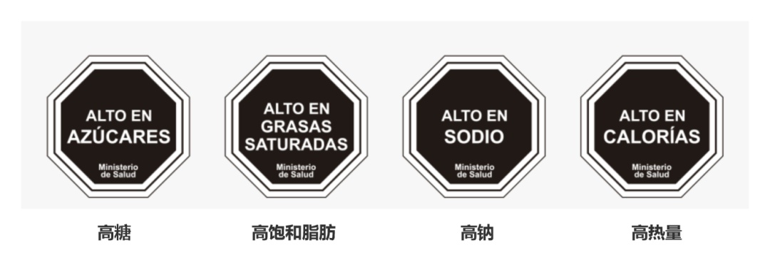 目前,智利、墨西哥、哥伦比亚、秘鲁、巴西等国家在相关法规中规定,如果每100克或毫升预包装食品/饮料中热量、糖、钠、脂肪含量超过设定阈值,必须针对超过阈值的营养成分贴上警示标识。除巴西(黑色矩形)外,其余几个国家警示标识均为黑色八角形。贴上此类标识即表明食品/饮料中特定营养素(热量、糖、钠、脂肪)超过相关标准限值,需理性选择。