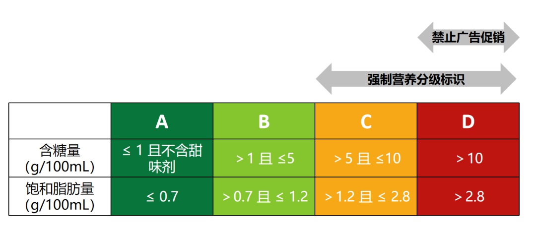 新加坡此举属于营养分级法,即根据饮料中的含糖量和饱和脂肪量,将饮料分为A、B、C、D四个等级。A级含糖量和饱和脂肪含量最低,D级最高。评为A、B级的饮料可自行选择贴或不贴,但C级和D级必须在饮料包装上贴标识,而且评为D级的饮料除要贴标识外,还禁止广告促销。