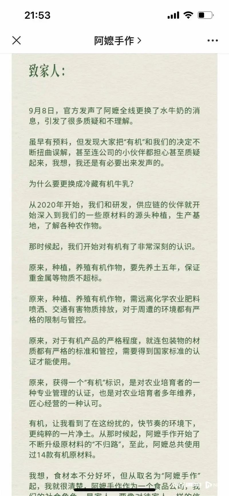 9月9日,阿嬷手作创始人邓倩针对此事发文,解释了企业为何将产品更换成冷藏有机牛乳。其表示,从2020年开始,品牌和研发,供应链的伙伴就开始深入企业一些原材料的源头种植,生产基地,了解各种农作物,并表示从那时候起,就开始对有机有了非常深刻的认识。