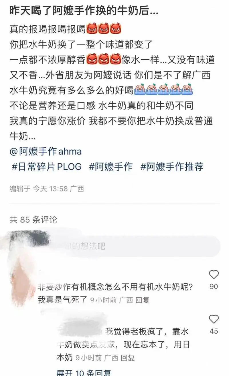 近日,被称为“广西之光”的茶饮品牌阿嬷手作因将含奶饮品及雪糕的水牛奶原料全线更换成冷藏有机牛乳,引发了部分消费者的质疑和不解,被消费者吐槽不好喝。9月9日,阿嬷手作创始人针对此事发文回应解释了更换成有机牛乳的初衷,并表示希望大家能够支持有机农业。