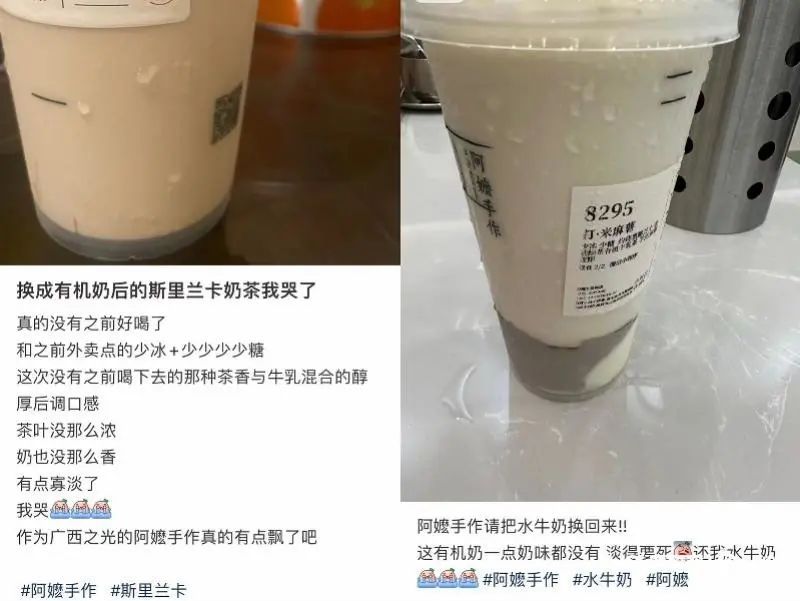 尽管阿嬷手作提到,有机牛每日享受如有机玉米压片等的有机餐食,餐标可高达200元一天,但在社交平台上,有网友要求阿嬷手作将原料换回水牛奶,称更换原料后的饮品没有之前的好喝了,“这次没有之前喝下去的那种茶香与牛乳混合的醇厚后调口感,茶叶没那么浓,奶也没那么香”“把水牛奶换了一整个味道都变了,像水一样,又没有味道又不香”,有网友还质疑阿嬷手作炒作有机的概念。