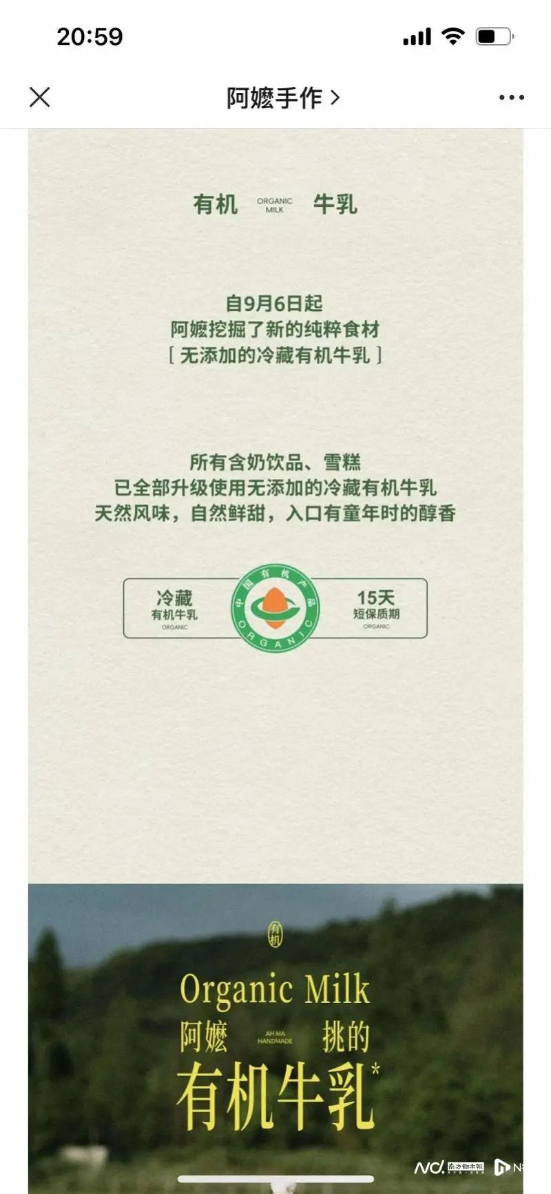 9月8日,阿嬷手作官方公众号发文称,自9月6日起,阿嬷手作所有含奶饮品、雪糕已全部升级使用无添加的冷藏有机牛乳。