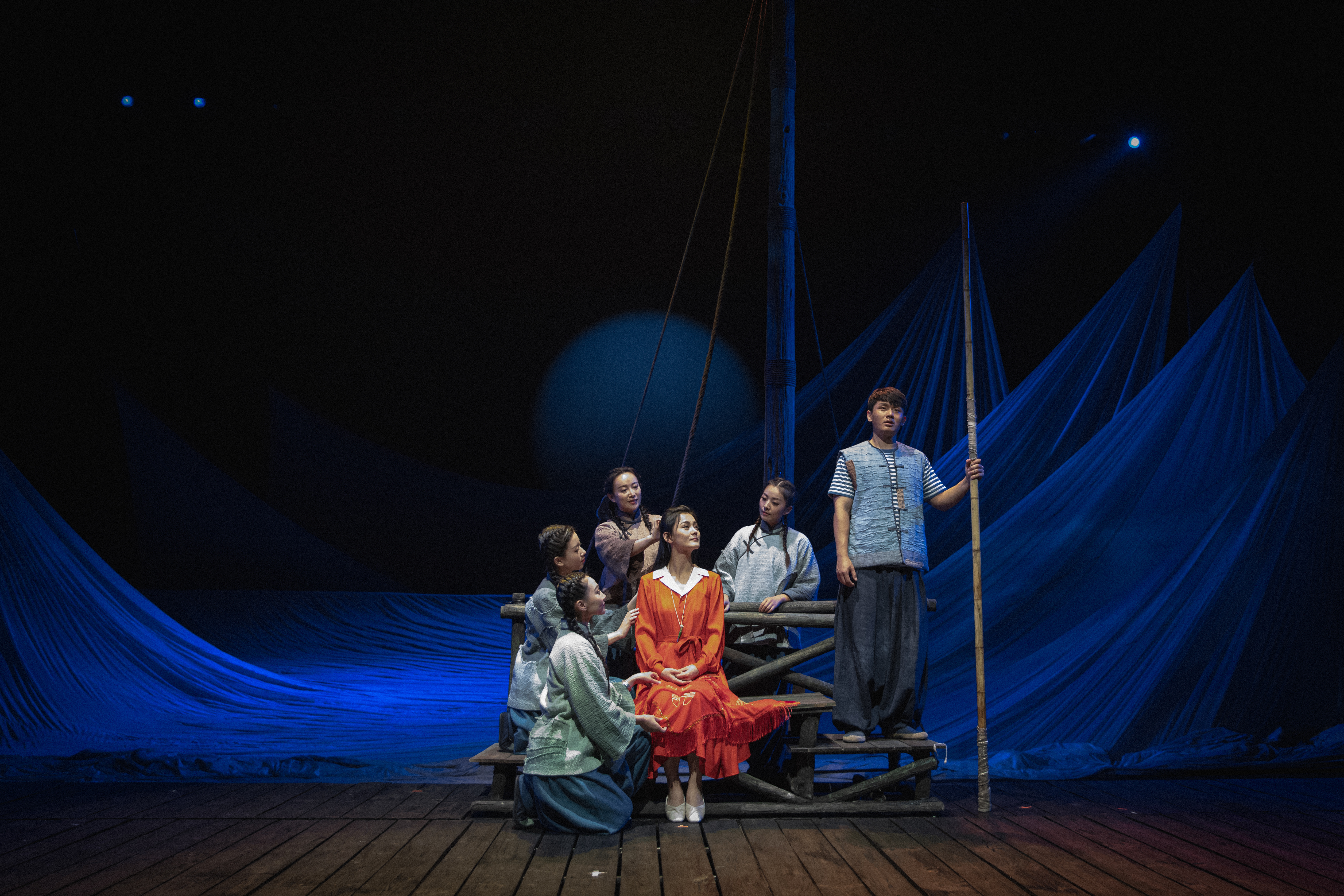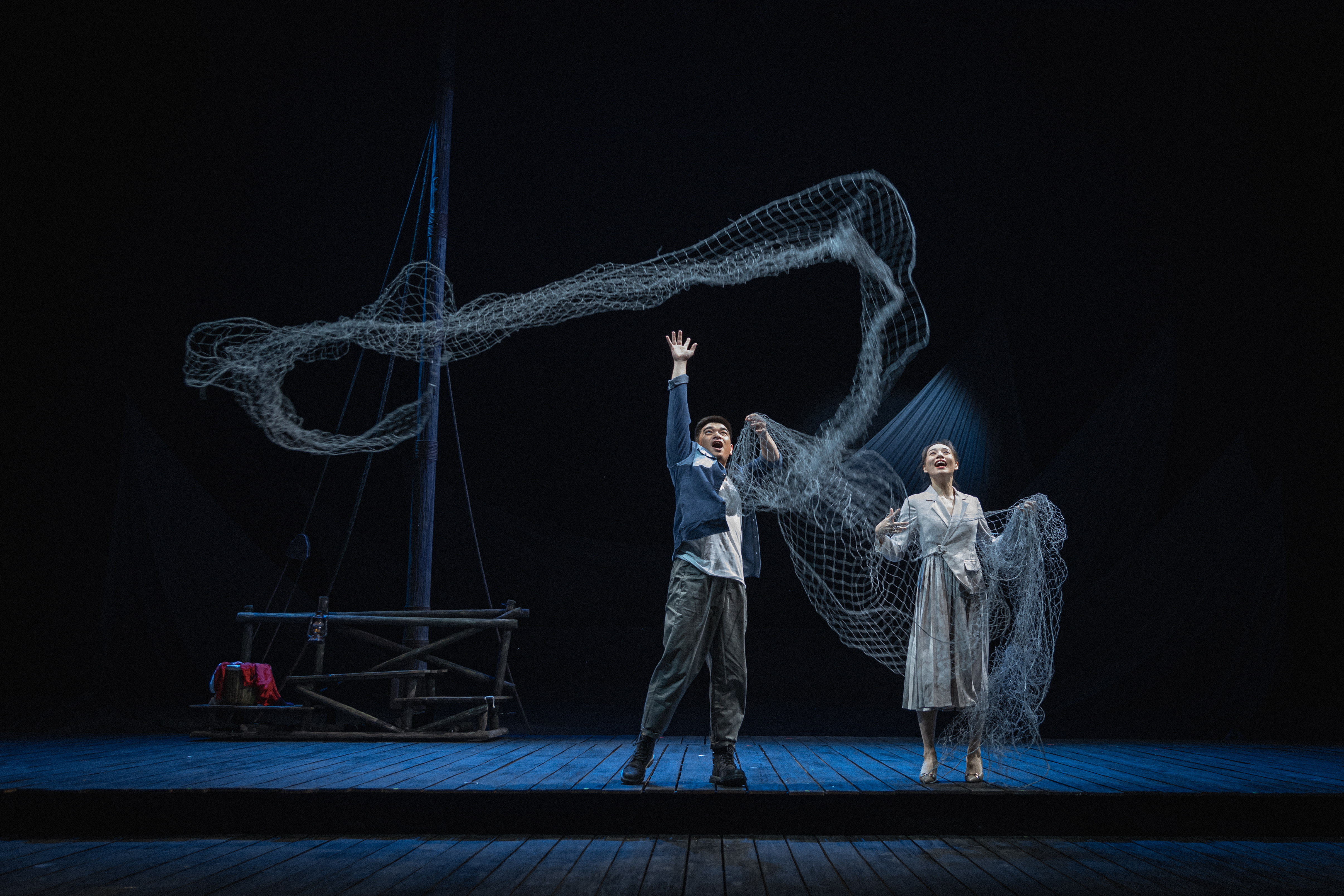 值得一提的是,整个舞台通过硕大而起伏的“网”来表现长江之水、表达东方诗意与象征隐喻,用大幅的纱和绸布,营造出波澜起伏的水世界,配以悠扬的渔歌等音乐的烘托,让这部话剧在简约灵动的舞台上精彩呈现。在创作方式上,具有新意的即兴戏剧、身体工作坊等贯穿于《沧桑巨变》的排练全程,“我们充分激发演员的创造力,边排边创,很多场面、很多表演,甚至很多台词都是在排练场中创造的,使得整体故事的表现更加鲜活!”在卢昂看来,勤劳的卧鱼岛人不懈地耕耘着、守护着、寄望着、开拓着……犹如这奔流不息的长江之水,波澜壮阔,一往无前。人与自然的关系,归根结底是人与人的关系。