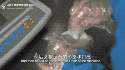 当大熊猫出现生病症状时,兽医会通过检查大熊猫的血液、尿液、粪便和组织样本来分析病因,并根据大熊猫的年龄、体重、病情等情况进行用药剂量的调整。再根据药的形态和口感,加入适当糖分,混合在牛奶、水或夹在窝窝头、水果中喂给大熊猫。