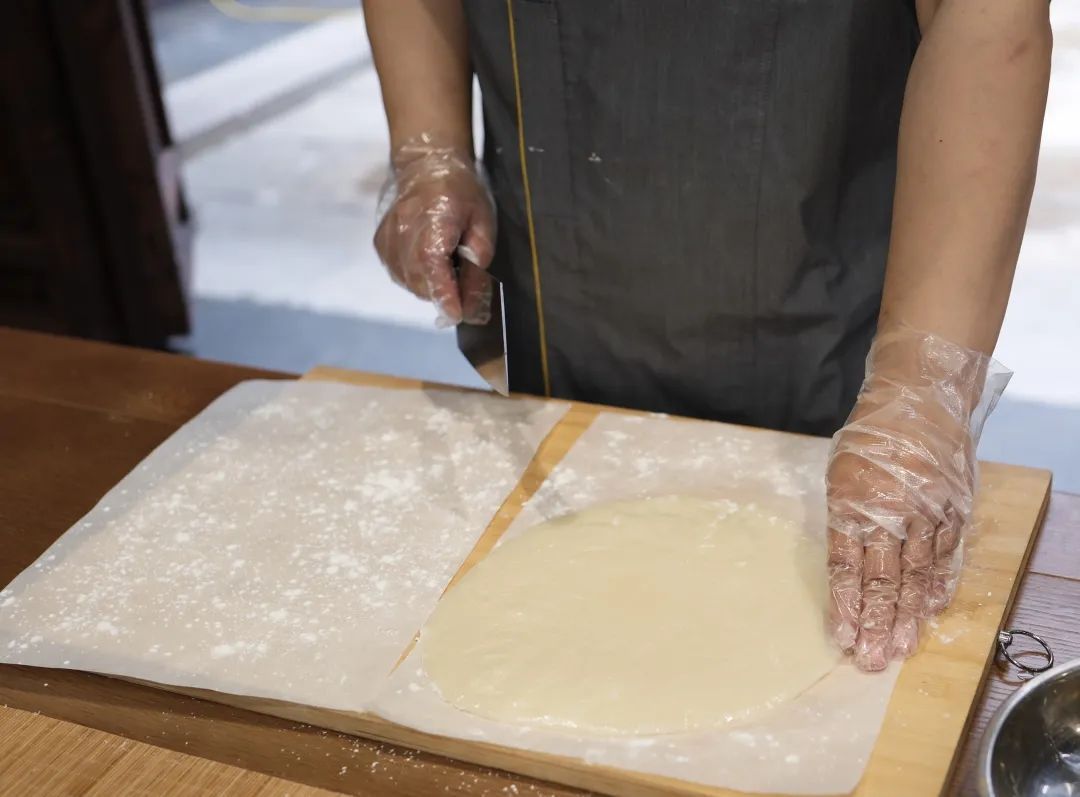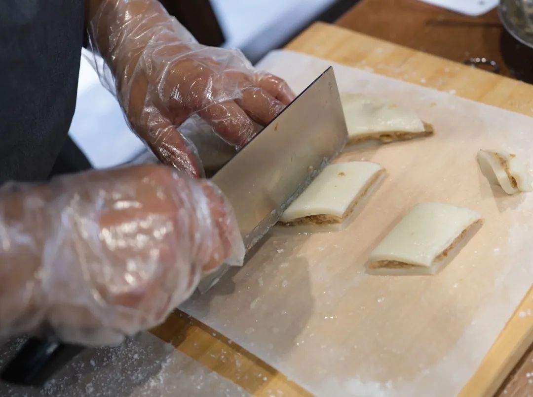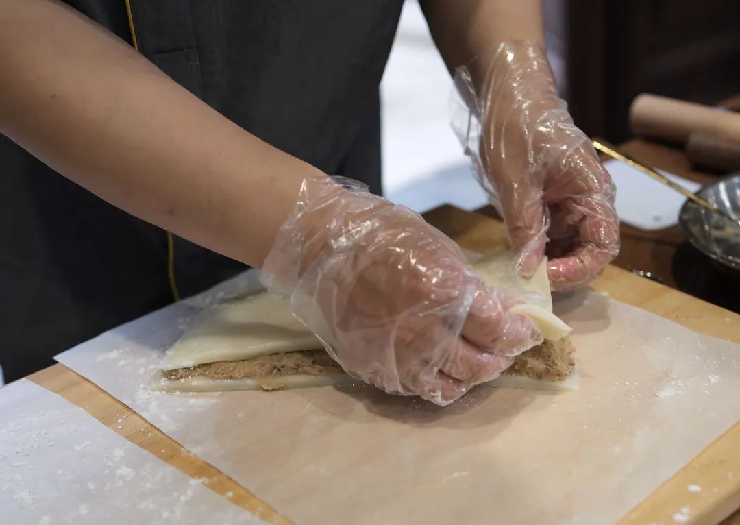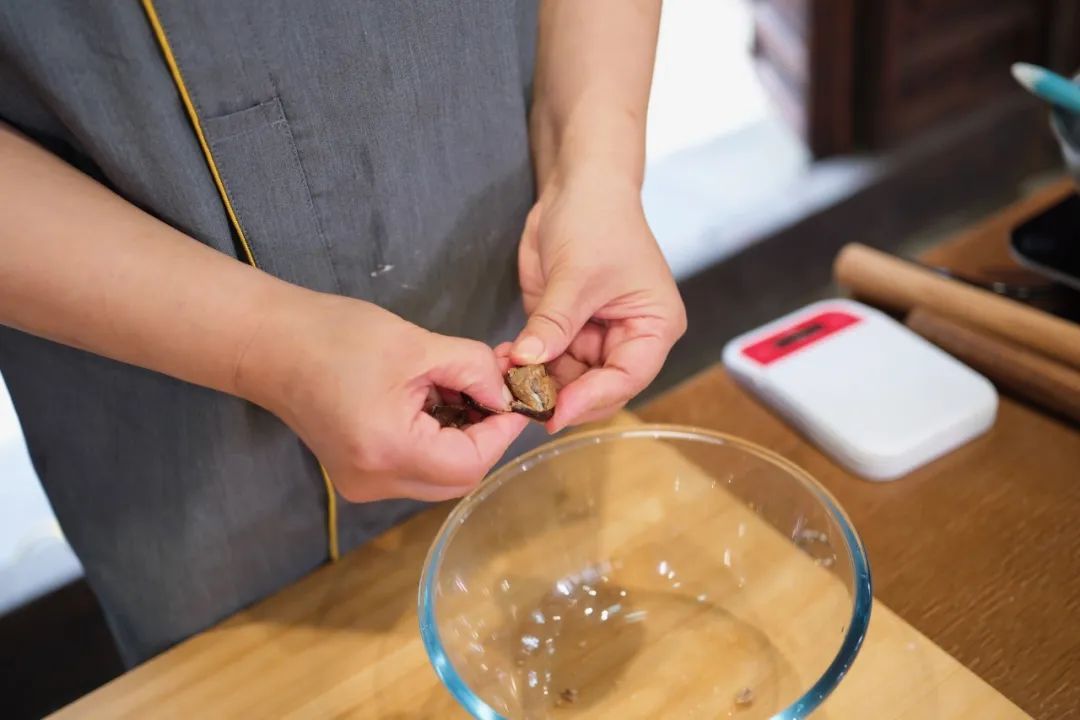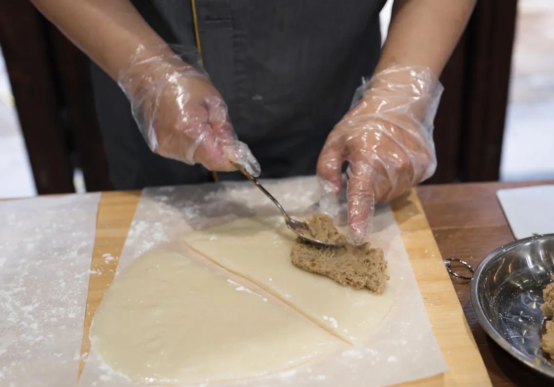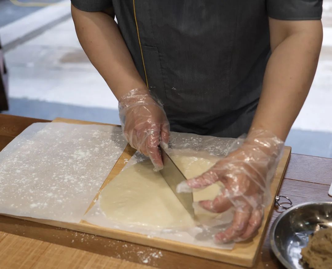 取出成型糯米皮,对切,一半铺上栗子泥后,覆盖上另一半。