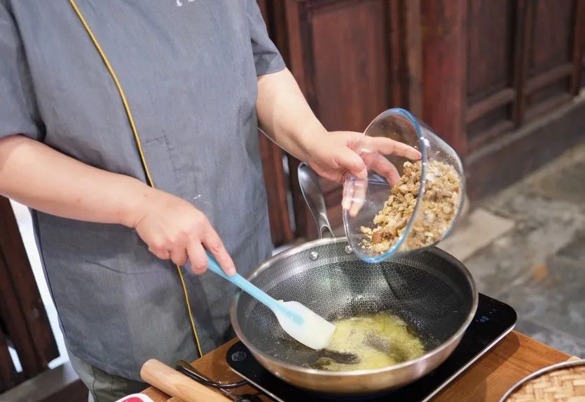热锅,加入黄油,倒入熟板栗,炒至细碎。