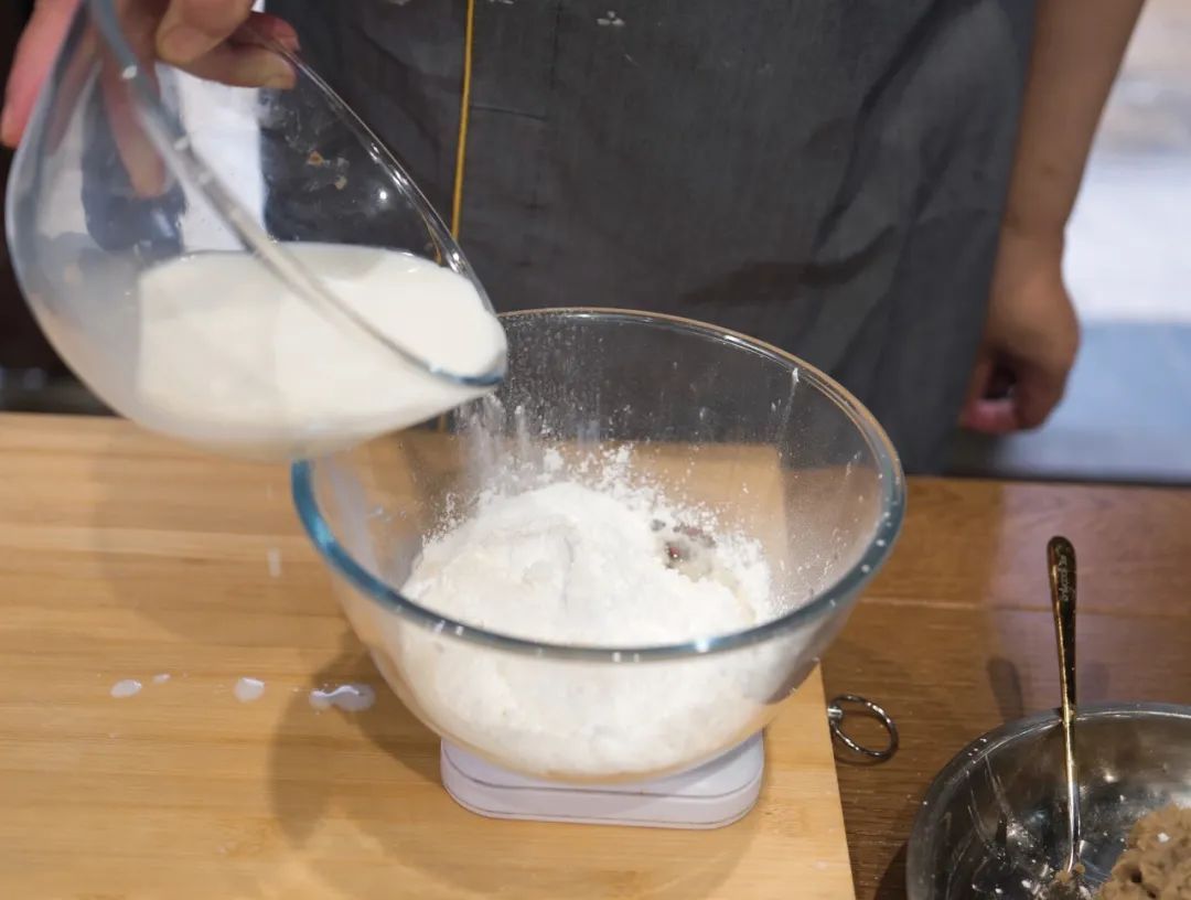 100克糯米粉中加入20克玉米淀粉,倒入5克植物油,混入牛奶搅拌。