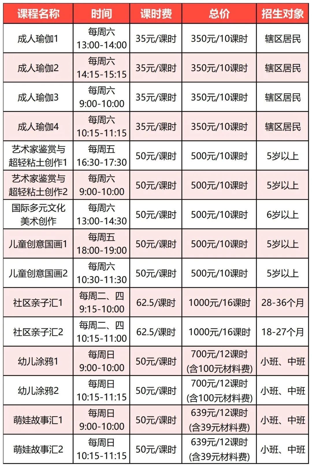 -请点击查看大图- 报名方式 请扫描下方二维码,选择课程进行报名 成人瑜伽 ☆ 1班:每周六13:00-14:00 ☆ 2班:每周六14:15-15:15 上课地点:社区党群服务中心(浦申路520号)二楼锦汇空间 报名人数:10-15人(每班满12人开班) 总课次:10次(9月16日、9月23日、10月14日、10月21日、10月28日、11月4日、11月11日、11月18日、11月25日、12月2日) ☆ 3班:每周六 09:00-10:00 ☆ 4班:每周六 10:15-11:15 上课地点:滨浦第三居民区党群服务站(浦雪南路366弄14号)二楼206室 报名人数:10-15人(每班满12人开班) 总课次:8次(10月14日、10月21日、10月28日、11月4日、11月11日、11月18日、11月 25日、12月2日) 课程介绍:瑜伽有着悠久的历史,起源于古印度,它是一种关于身体、心理和精神的练习,是一种达到身体、心灵与精神和谐统一的运动方式,目的是为了改善身体和心性。 温馨提醒:课程需要自备瑜伽垫。 (报名后请根据班次进群) 艺术家鉴赏与 超轻粘土创作 ☆ 1班:每周五16:30-17:30 ☆ 2班:每周六09:00-10:00 上课地点:社区党群服务中心(浦申路520号)一楼锦彩生活室 报名人数:8-15人(每班满8人开班) 总课次:10次(9月15日/9月16日、9月22日/9月23日、10月13日/10月14日、10月20日/10月21日、10月27日/10月28日、11月3日/11月4日、11月10日/11月11日、11月17日/11月18日、11月24日/11月25日、12月1日/12月2日) 课程介绍:小朋友们能了解到艺术家的时代背景与创作个性,发现他们画作的骨架和灵魂;能通过超轻粘土创作,锻炼手眼协调能力,启发创作潜力,随性地去表达自己的想法和心情。 备注:报名成功后,会有课程负责老师电话联系。 儿童创意国画 ☆ 1班:每周五18:00-19:00 ☆ 2班:每周六10:30-11:30 上课地点:社区党群服务中心(浦申路520号)一楼锦彩生活室 报名人数:8—15人(每班满8人开班) 总课次:10次(9月15日/9月16日、9月22日/9月23日、10月13日/10月14日、10月20日/10月21日、10月27日/10月28日、11月3日/11月4日、11月10日/11月11日、11月17日/11月18日、11月24日/11月25日、12月1日/12月2日) 课程介绍:中国画具有简练、概括的特点。用毛笔蘸墨画画,可小可大、可粗可细、可干可湿,描画自如、变化无穷......在感受中华民族传统文化独特韵味的同时,提高孩子们的艺术修养,培养眼、手、脑协调能力。 温馨提醒:报名成功后,会有课程负责老师电话联系。 国际多元文化 美术创作 ☆ 1班:每周六13:00-14:30 上课地点:社区党群服务中心(浦申路520号)一楼锦彩生活室 报名人数:8-15人(每班满8人开班) 总课次:10次(9月16日、9月23日、10月14日、10月21日、10月28日、11月4日、11月11日、11月18日、11月25日、12月2日) 课程介绍:孩子们将一起游历、探索和学习不同地方的著名景点、文化、习俗等,在充满趣味性和互动性的绘画中,开启属于他们的创意之旅! 温馨提醒:报名成功后,会有课程负责老师电话联系。 社区亲子汇 ☆ 1班:每周二、四09:15-10:00 ☆ 2班:每周二、四10:15-11:00 上课地点:社区党群服务中心(浦申路520号)一楼锦彩生活室 报名人数:5-8人(每班满5人开班) 总课次:16次(10月10日、10月12日、10月17日、10月19日、10月24日、10月26日、10月31日、11月2日、11月7日、11月9日、11月14日、11月16日、11月21日、11月23日、11月28日、11月30日) 课程介绍:课程中,早教师亲身示范如何正确引导孩子,家长观察孩子的行为模式,通过被动到主动的亲子互动、集体游戏等方式,提高孩子们的社交能力、倾听能力、动手能力、自理能力等综合素质。 (报名后请进群) 幼儿涂鸦 ☆ 1班:每周日09:00-10:00 ☆ 2班:每周日10:15-11:15 上课地点:社区党群服务中心(浦申路520号)一楼锦彩生活室 报名人数:6-14人(每班满6人开班) 总课次:12次(10月15日、10月22日、10月29日、11月5日、11月12日、11月19日、11月26日、12月3日、12月10日、12月17日、12月24日、12月31日) 课程介绍:涂鸦是孩子从无意识涂抹状态向有意识表达发展的过程。课上,老师将会引导儿童学会表达静物、风景、动物、人物、想象的儿童画创作,并在授课时融入趣味场景教学,用以吸引儿童理解绘画常识与技法。
