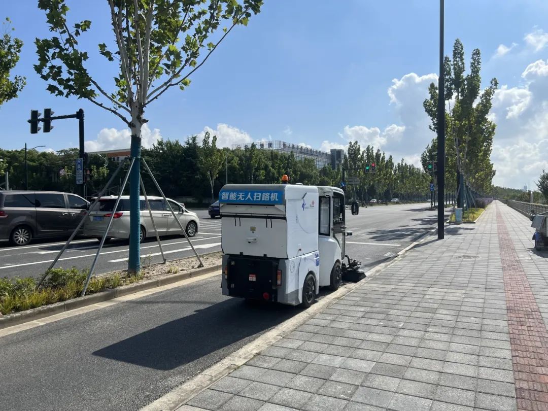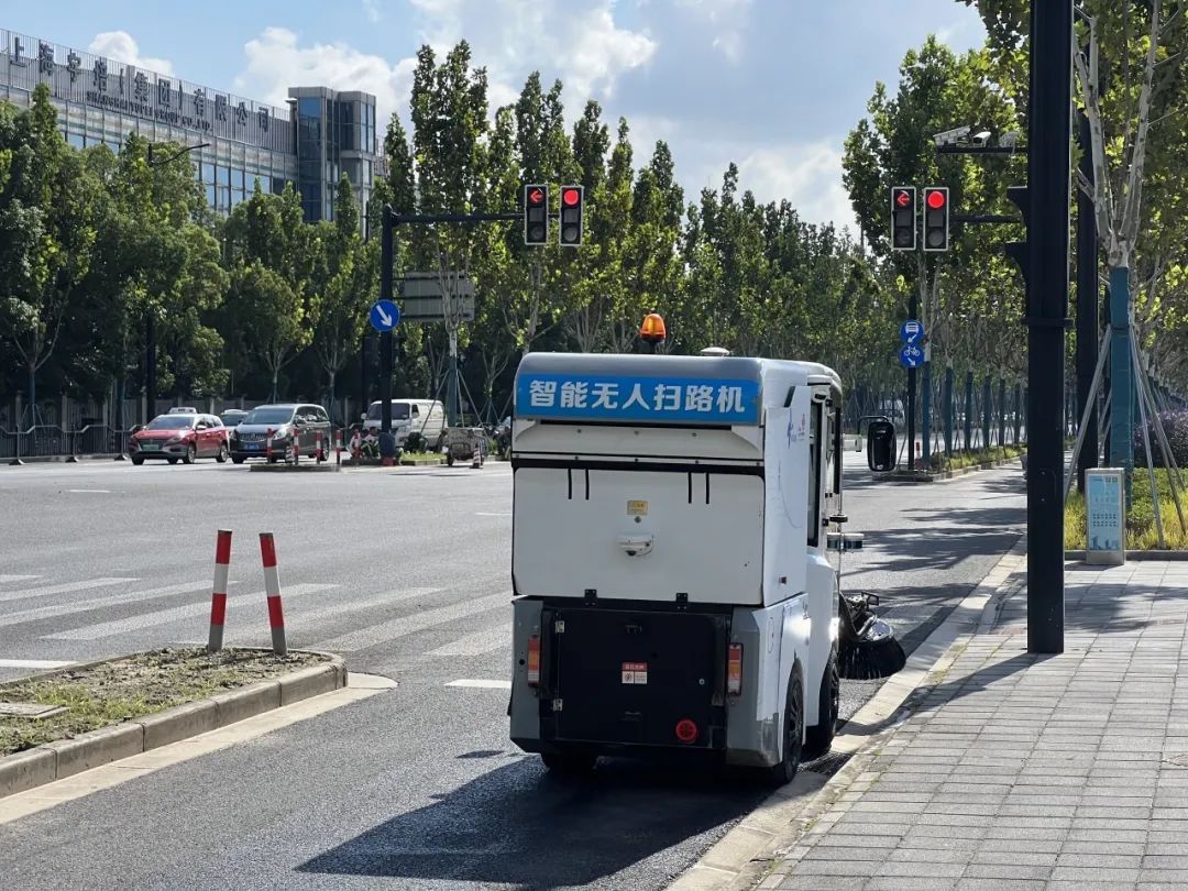 值得一提的是,该款智能无人扫路车拥有自动识别红绿灯的“黑科技”赋能。记者在现场看到,在金昌路金达路丁字路口红灯亮起时,车辆主动停止在安全线内,绿灯亮起时,它便再次前行清扫。