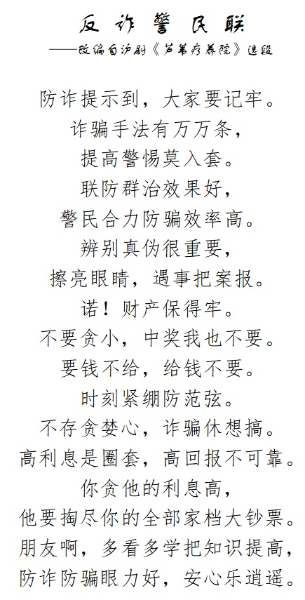 预防诈骗,社区有新招 近日,奉贤区青村镇荣贤社区沪剧班 “量身定制”的反诈沪剧唱段在社区唱响 将反诈的歌声带进直播间,走进人群中 荣贤社区创新宣传方式,在社区的反诈宣传角推出第一期的反诈直播。走进直播间,沪剧班的成员正在唱着这首新编词的《反诈警民联》,“辨别真伪很重要,擦亮眼睛,遇事把案报。” 通过生动易懂的歌词,提醒群众要警惕诈骗陷阱,拒绝“高利”诱惑,保护好个人财产,直播间吸引不少粉丝,也让反诈宣传真正“活起来”。 不仅仅在居委,随着社区民警的加入,这首《反诈警民联》的热度也在不断升高,让宣传工作除了入户走访、发放印有防诈小知识等相关内容的扇子等形式之外,有了更具吸引力、传播性的方式,小区里也传来歌声阵阵。 “这首反诈沪剧就像一张‘护身符’,护住我们的钱袋子。”居民李大爷告诉大家,其不久前接到一个陌生电话,对方称其中奖,需要进入某网页链接填写相关信息后再打入奖金。他想到在小区里听到的这首歌,于是留了心眼,没有相信。 反诈沪剧就是用大家能听得进、记得住的方式,给社区居民传递反诈意识。多一个人懂一点点,就少一个人被骗,这也是荣贤社区反诈宣传获成效的一个缩影。 “反诈沪剧+直播演出”的反诈宣传新形式,不仅让辖区众多居民轻松实现文化艺术的享受,更围绕反诈重点加强联动,形成反诈知识普及合力。下一步,荣贤社区也将逐步壮大群防群治力量,实现从“个别参与”到“广泛参与”,从“条块联动”到“全民联动”的逐步升级。