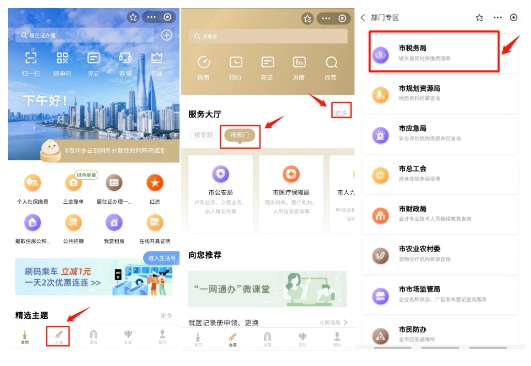 打开“随申办”APP、“随申办”支付宝小程序或微信小程序,点击首页下方菜单栏“办事”栏目,选择“按部门”并点击“更多”,找到“市税务局”,就能看到税务事项清单啦~