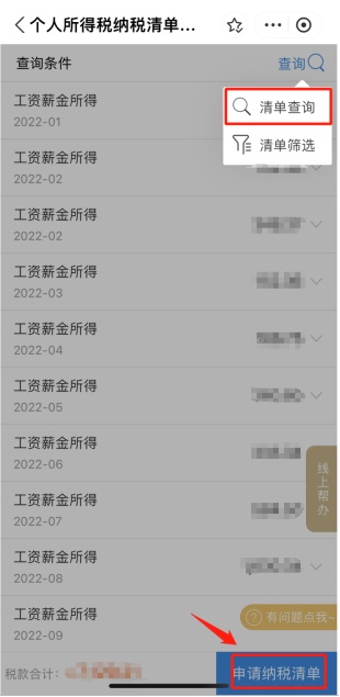 现在前往“个人所得税纳税清单开具(上海)”服务,点击右上角“查询”-“清单查询”,选择税款所属期后,点击右下角“申请纳税清单”,就能快速开具啦~