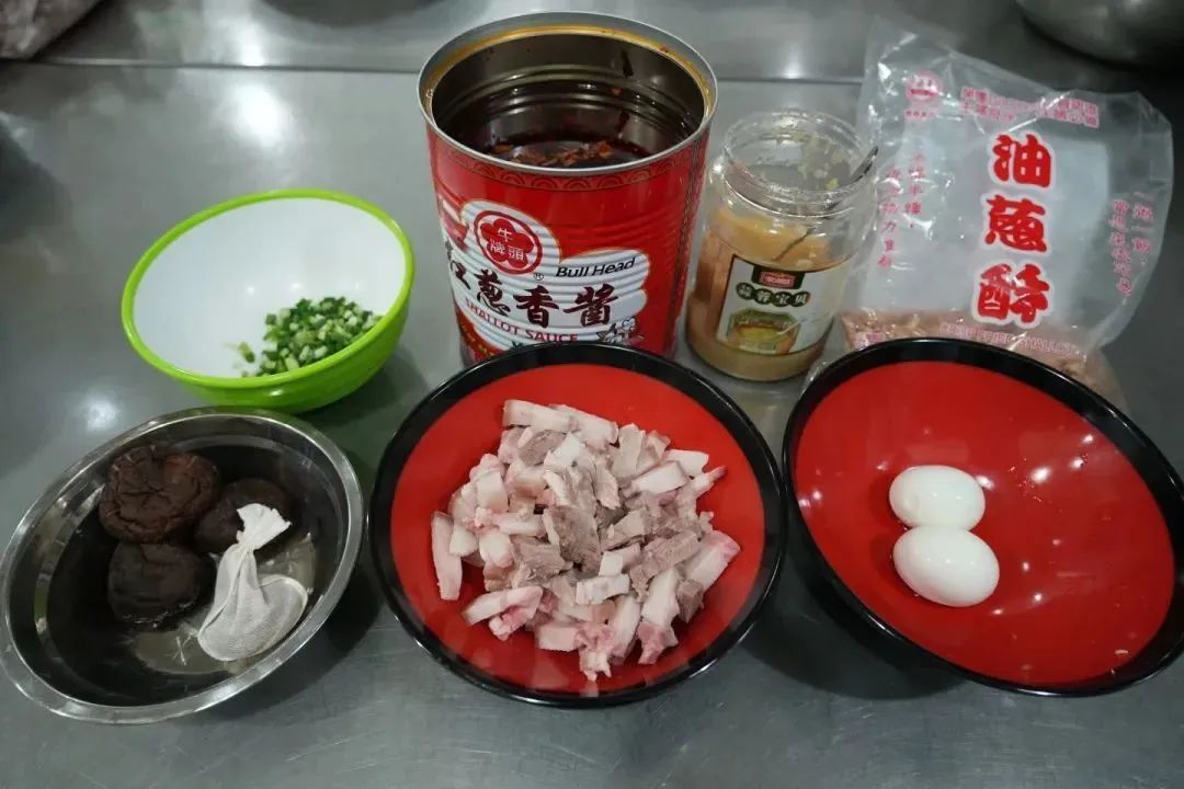 五花肉1000克、干香菇3个、油葱酥80克、红葱香酱80克、蒜蓉酱50克、老抽50克、白糖80克、生抽150克、葱姜蒜少许、卤料包一个、白煮蛋2个(米饭、青菜、腌萝卜适量)
