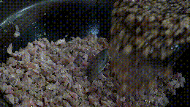 1.锅里热油,倒入葱姜蒜末翻炒,煸香后加入肉丁,炒至肉色变白。
