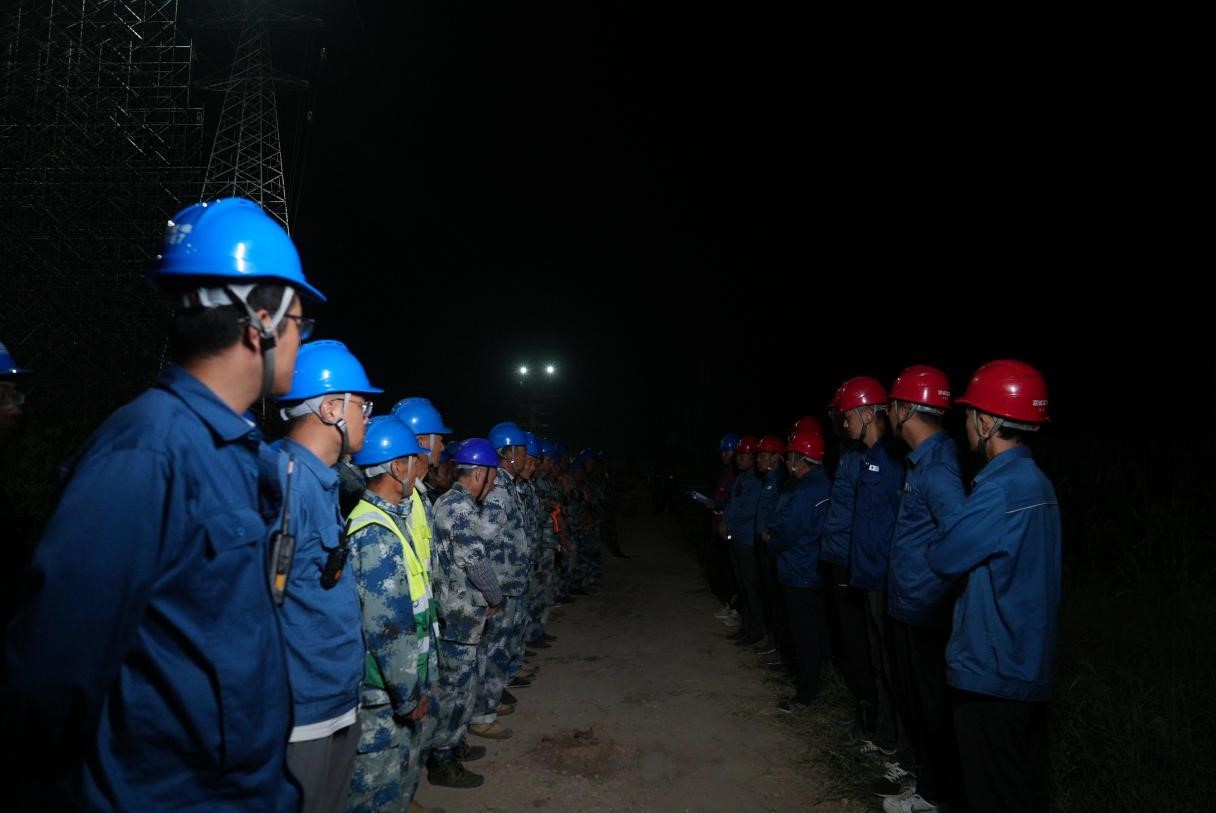跨越工作选择在凌晨1点到4点窗口期进行。为了确保跨越施工安全,国网济宁供电公司9月6日晚22时现场进行施工准备工作,召开施工站班会。针对夜间施工视线差、作业风险高和监护难度大等困难,现场布置了高亮度探照灯和无人机空中照明,确保各作业面清晰可见。接到封网指令后,现场人员首先完成验电接地工作,操作提升设备迅速提升导线就位,有条不紊地调整导线弧垂及各处金具调整安装,塔上工作人员与地面指挥人员配合默契,参建人员严格跨越施工安全、技术交底,确保安全风险源管控措施落实到位,“同进同出”管理人员履职尽责,全程视频监督,圆满完成跨越任务。
