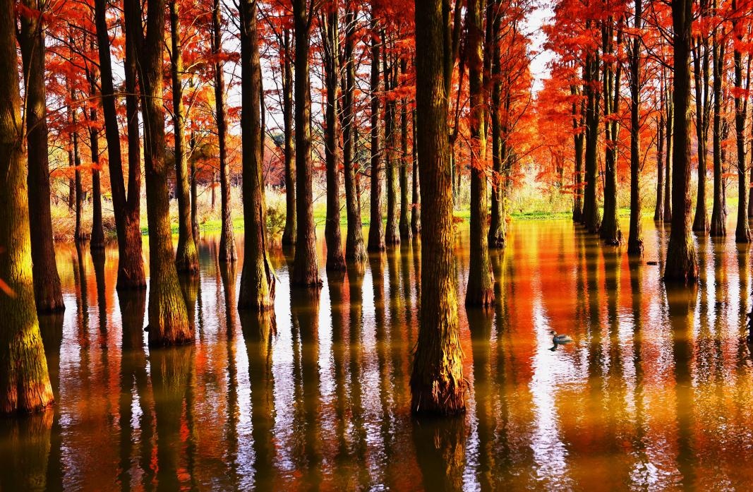 以水为脉、碧波荡漾 是水乡青浦的主要特色之一 位于沪苏浙交界处的「蓝色珠链」 由“七湖一河”串联而成 (七湖:火泽荡、南白荡、西白荡、大葑漾、小葑漾、大莲湖、任屯湖;一河:北横港) 是上海湖泊水系中 最具原生态特质的区域 从空中俯瞰 宛如一块碧玉 镶嵌在广袤的金泽水域上 风光旖旎、璀璨动人 让我们一起走近蓝色珠链 遇见“美好生活”~ 蓝色珠链之美 美在“处处有景 人水相亲” 伴着清晨的第一缕阳光 沿着「大莲湖」绿道骑行或徒步 深吸一口气,满是初秋的味道 入眼处 湖水澄澈,绿荫如盖,飞鸟起舞 仿佛置身一处蓝绿相融的生态秘境 沿大莲湖东侧的湖滨道路一直走 到达被誉为“池杉奇观”的「水上森林」 走入水杉秘境 色彩斑斓、层林尽染 大片池杉高耸入云,整齐排列 在粼粼波光映衬下 形成令人惊艳的水上森林景观 每一次顾盼 都似一幅美得让人沉醉的风景画!