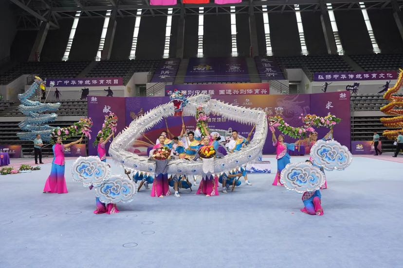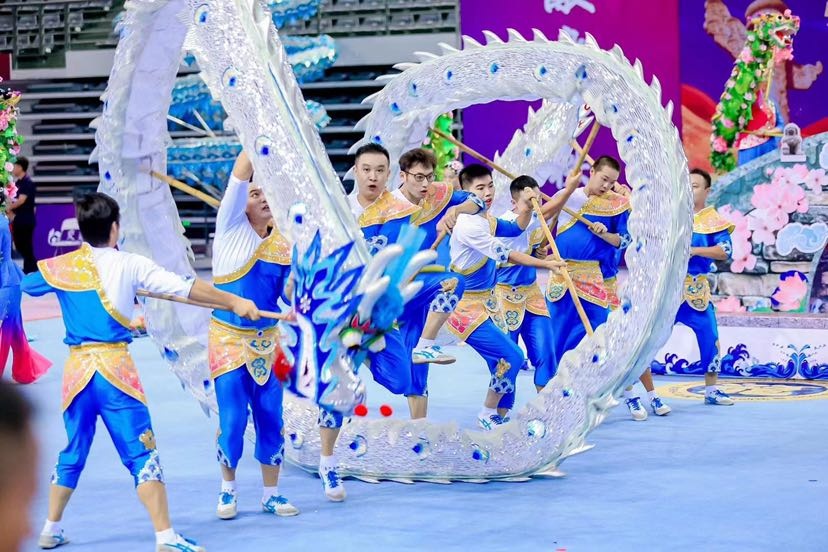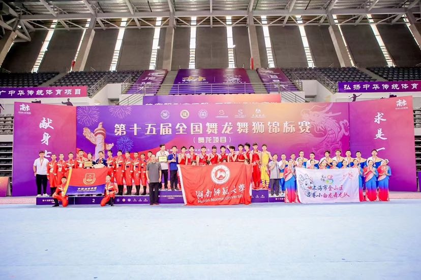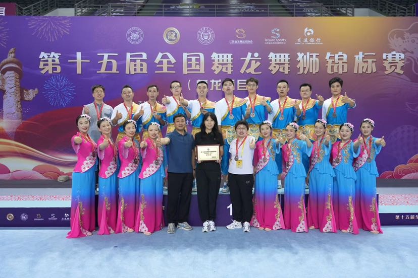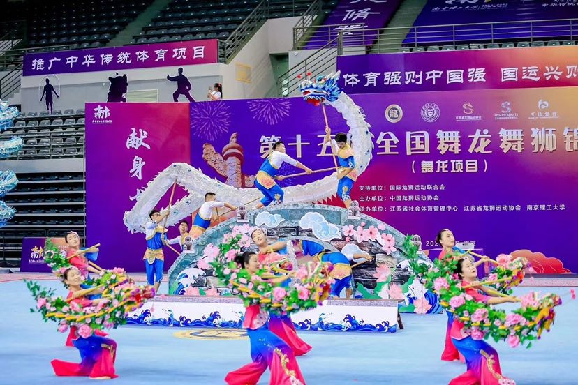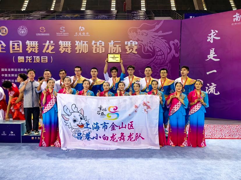 9月9日下午,第十五届全国舞龙舞狮锦标赛(舞龙项目)在南京理工大学体育中心开赛!在9月11日上午举行的第十五届全国舞龙舞狮锦标赛(传统舞龙混合组)比赛中,金山区吕巷镇舞龙队荣获第三名。 第十五届全国舞龙舞狮锦标赛由国际龙狮运动联合会支持,中国龙狮运动协会主办,江苏省社会体育管理中心、江苏省龙狮运动协会和南京理工大学承办。该赛事至今已连续举办十四届,本次大赛是参赛人数最多、规模最大的舞龙赛事,共70余支舞龙参赛队在本次大赛上披荆斩棘,激烈角逐。本次龙狮锦标赛共设舞龙、南狮、北狮、彩带龙、创意龙狮5个大项,其中舞龙、南狮、北狮还分别设置了男子组、女子组和混合组。全国舞龙舞狮锦标赛也是广大龙狮运动爱好者展示自我、切磋技艺、交流促进的良好平台,对弘扬民族传统文化,推动龙狮项目发展,促进龙狮文化交流,提高龙狮运动水平,传承龙狮精神具有重要意义。 比赛集锦 吕巷镇舞龙队参赛节目《龙舞桃乡》既有舞龙的表演技巧和难度动作,又融入了很多民间舞蹈等表演元素在其中。开场是祭祀仪式,百姓与舞龙队员虔诚地祈求小白龙,能让吕巷风调雨顺、五谷丰登。之后一朵朵云牌组合起来的云海,唯美而壮阔,小白龙在云海中穿梭,欢乐地起舞嬉戏,场面恢宏大气。 随着音乐的不断变化,小白龙在田间小岸边取水,在石拱古桥上连绵起伏,淋漓尽致地展现出“龙”的游弋、起伏、翻腾、穿越。桃花龙演绎着从蔬果园中的初生小苗到硕果累累,变化多姿的造型,巧妙灵活的舞步,赋予了“龙”鲜活的生命力。大龙和小龙动作衔接和递进十分紧凑,只见龙在飞腾,人在翻舞,龙身迎风,忽而腾跃,忽而翻滚,恰似蛟龙出海,令人屏息凝神,目不暇接。 赛前花絮 接到比赛通知后,舞龙队就开始紧锣密鼓地安排赛事训练计划。为了能更好地展示吕巷小白龙的精气神,吕巷镇舞龙队在平时训练的基础上延长了训练时间,增加了训练次数。在国家级非遗传承人陆大杰老师的精心指导下,反复练习、不断完善,针对一些易错易失误的舞龙动作进行专项训练,力争将吕巷小白龙最好的风采展现给大家。 到达比赛地点后,舞龙队队员们抓住每次场地训练的机会进行彩排,走位、定点、矫正造型......正所谓台上一分钟,台下十年功,多少个日日夜夜的挥舞、奔跑都为了比赛的那一刻,功夫不负有心人,通过此次大赛也进一步提升了吕巷小白龙的知名度与美誉度。