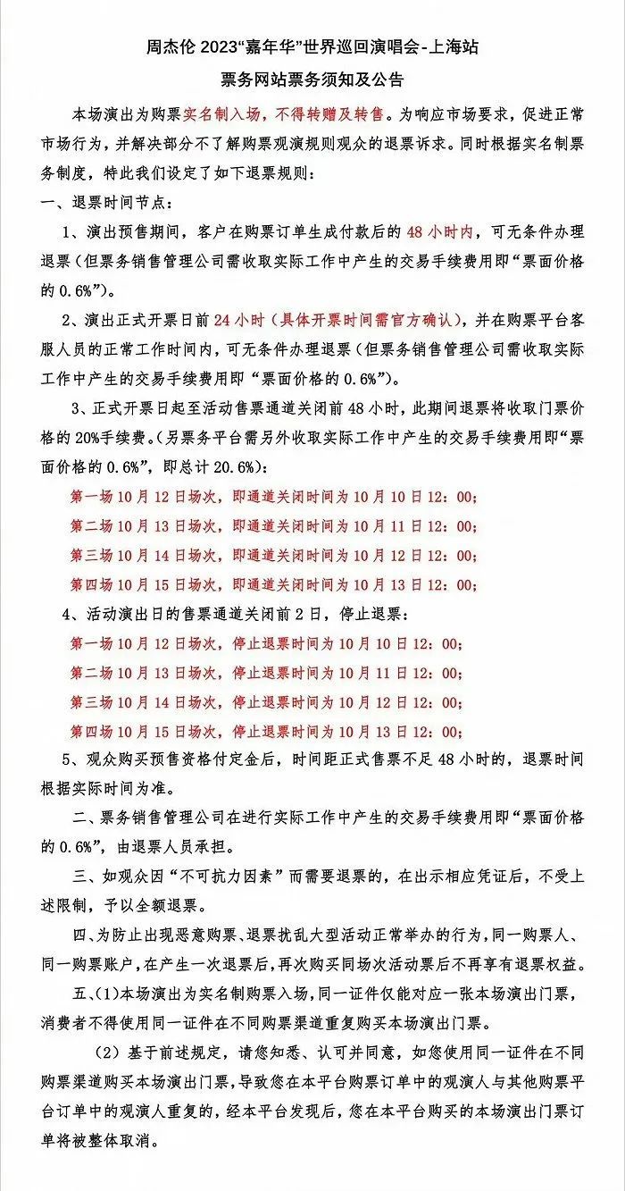 周杰伦2023“嘉年华”世界巡回演唱会上海站将于10月12日至15日举行,9月12日18时开启门票预售。演唱会官方票务平台为大麦、猫眼以及票星球。开票前一天,三家票务平台发布公告,宣布本场演出为购票实名制入场,门票可退,但不得转赠及转售,演出开始前48小时停止退票。“周杰伦上海演唱会强实名”随即登上微博热搜。