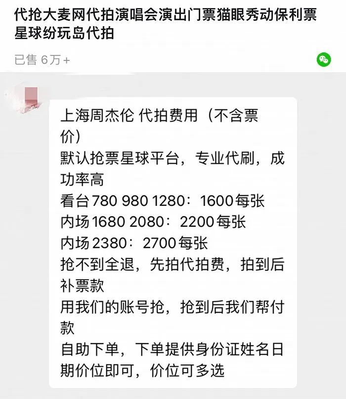 淘宝某个代拍链接有超过6万人付款,该链接中周杰伦上海站门票的代拍价格1600元起步。但“强实名制”并不能完全制止“黄牛”的行动。在热门演出门票供给远小于需求的情况下,“黄牛”难以通过倒卖门票获利,却涌现了代拍的业务。所谓代抢,是指“黄牛”获取个人的身份证件信息后为其进行抢票。代拍俨然成为一种热门的服务,在淘宝上不乏以代拍为产品的店铺,其中某个代拍链接中已有超过6万人付款。该链接中,周杰伦上海站门票的代拍价格分为1600元、2200元、2700元三个档次。1600元对应780元、980元和1280元的看台票;2200元对应1680元和2080元的内场票;2700元对应2380元的票。而该价格仅仅是代拍的服务费,并不包括门票本身的费用。由此可见,“强实名制”的确是高效打击“黄牛”的一种方式,但并不能一劳永逸,演出门票还有待更加严格的监管。