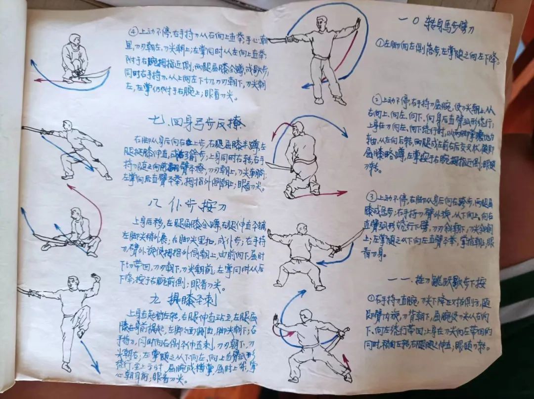 从9月6日到10月2日,我每天用工余和业余时间抄录文字和所有的示意图,共24个页面,67个规定套路,其中176段文字说明我用纯蓝墨水钢笔抄写,176个人物套路动作示意图则用黑墨水钢笔照葫芦画瓢地照搬画下来,关键的动作走向则用红墨水钢笔示意。当我完成了所有的抄录并装订成册后,在还给邻居那本书时,给他看了我的手抄本,他也为我高兴,说我有这样的决心抄书,一定能练好武功和刀术。