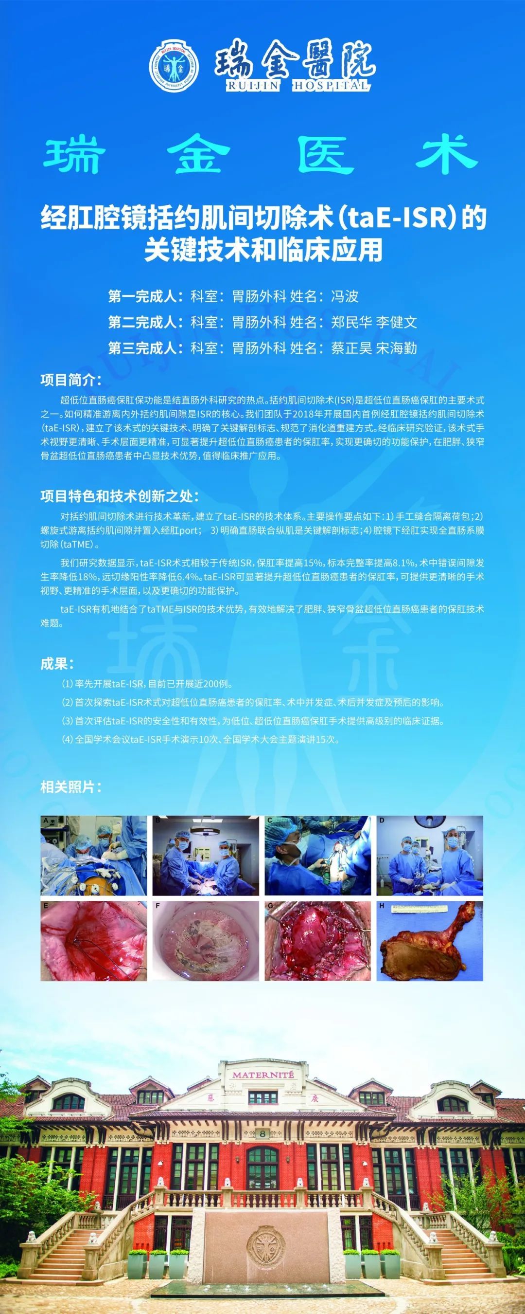 近年来,直肠癌的发病率和死亡率逐渐上升,已经成为对我国国民健康产生重要威胁的疾病之一。在治疗结直肠癌方面,外科手术是关键的治疗手段之一。括约肌间切除术(ISR)作为一种保肛手术方式,在肛门功能的保留方面表现出了显著的潜力。与经腹会阴切除术相比,经肛ISR在肿瘤学方面的结果相近,但可以提高超低位直肠癌患者的保肛率,从而改善患者的生活质量。然而,传统的经肛ISR存在一些局限,如手术视野狭窄、易误入错误解剖平面、术后出现吻合口漏、排便功能障碍等并发症发生率较高。为了弥补这些不足,经肛全直肠系膜切除术(taTME)应运而生。因此,我院的胃肠外科冯波医生团队创新性地结合了ISR术式和taTME术式,于2018年成功实施国内首例taE-ISR。其目标在于在确保肿瘤彻底切除的基础上,尽可能地保留患者的肛门功能,从而提高术后的生活质量。