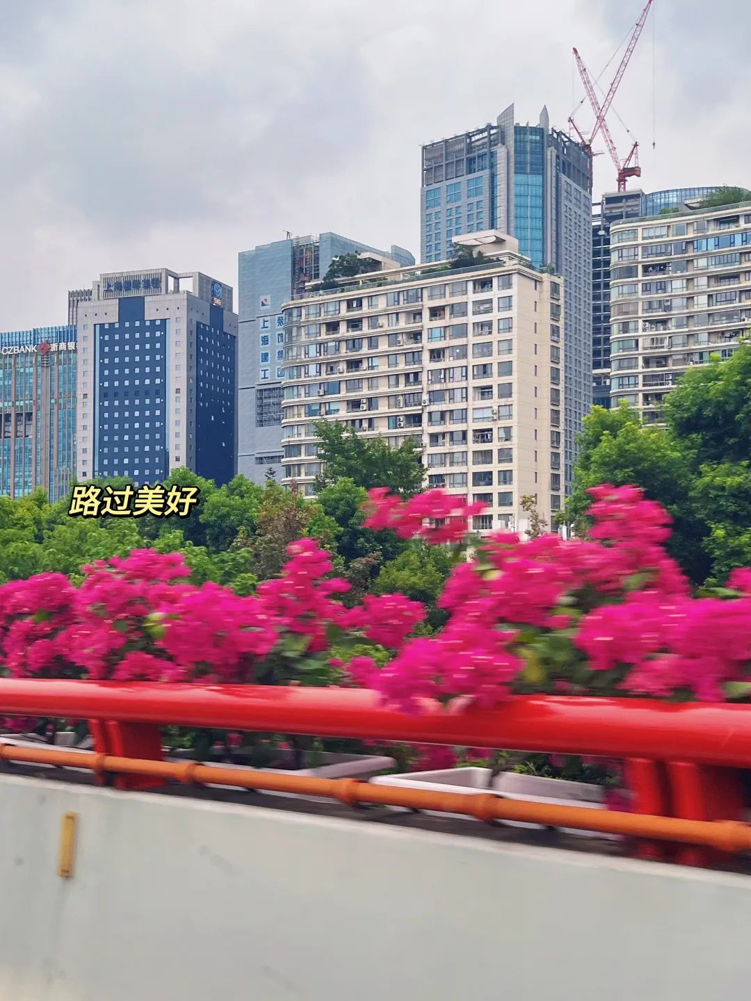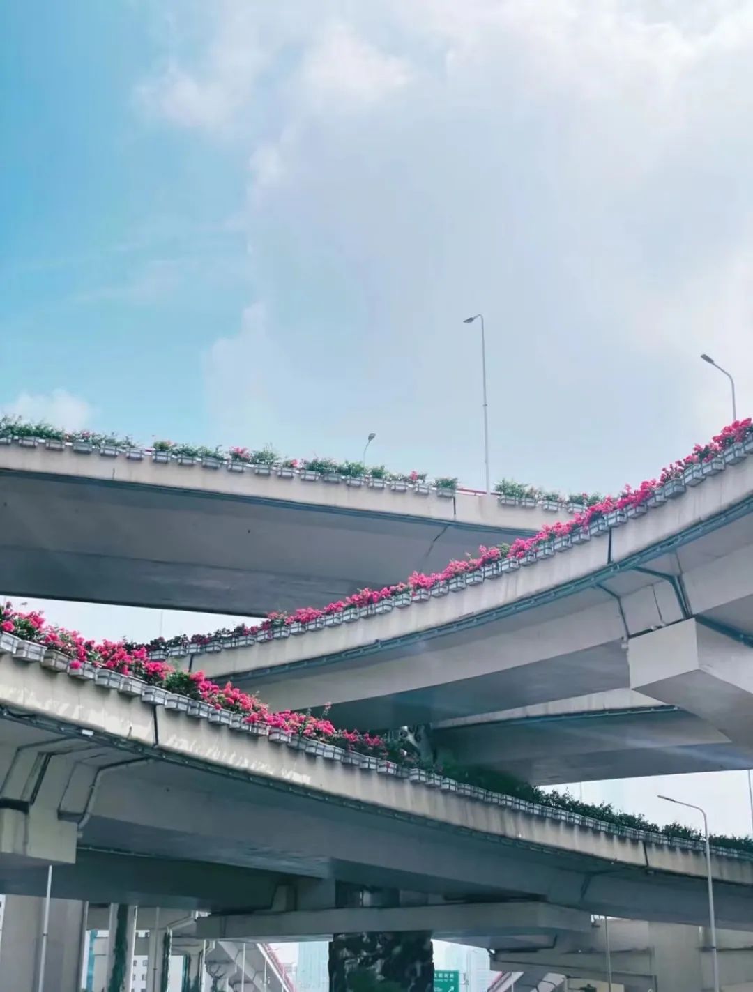 高架桥上盛放的三角梅后,